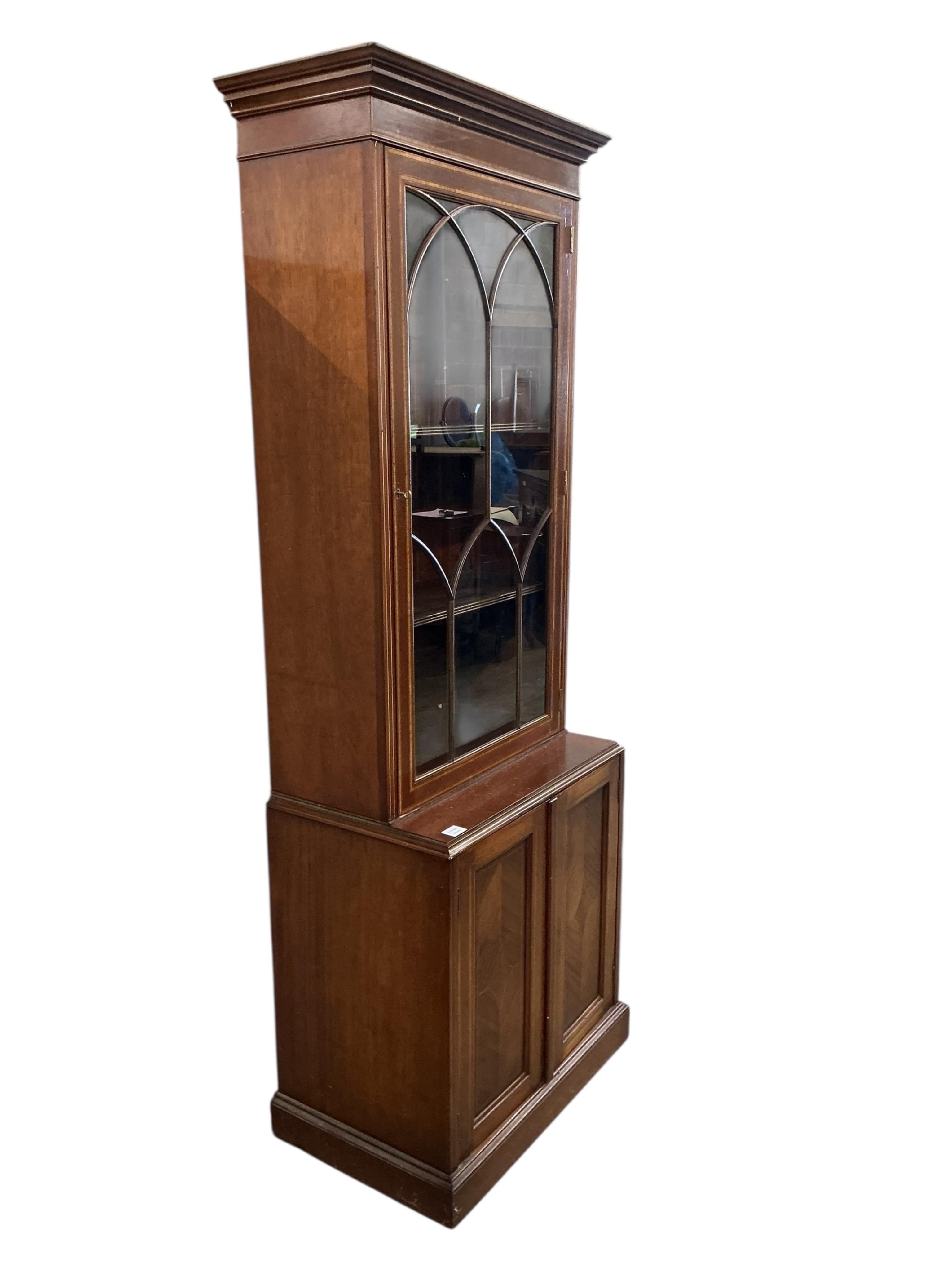Lot 1294 , A narrow inlaid mahogany bookcase in two parts, width 48cm, depth 46cm, height 207cm