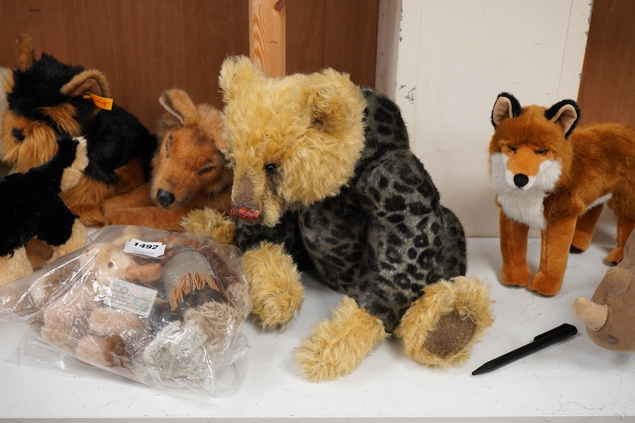A Steiff blond Teddy bear with growler, four other Steiff animals, and twelve other soft toys, the first 38cm