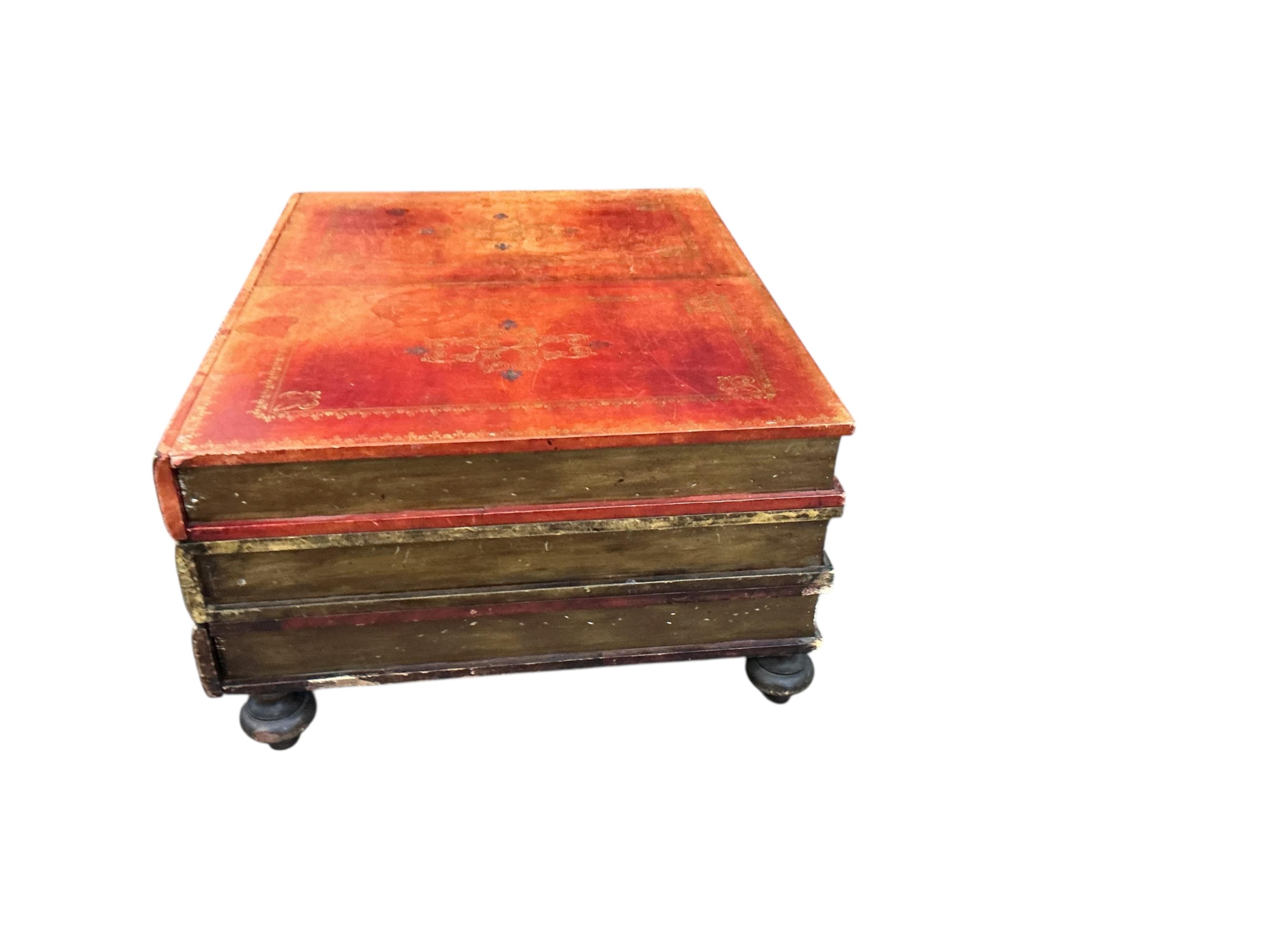 Lot 1437 , A gilt tooled leather covered three drawer coffee table modelled as a stack of books, width 90cm, depth 70cm, height 41cm