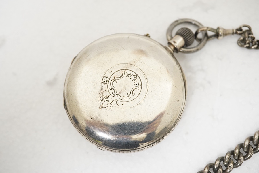 An Edwardian silver half hunter keyless lever pocket watch 'The Bank Watch', by J.W. Benson, with Roman dial and chapter ring and subsidiary seconds, the signed three quarter plate movement numbered 1056073, together with a silver graduated curb link albert.