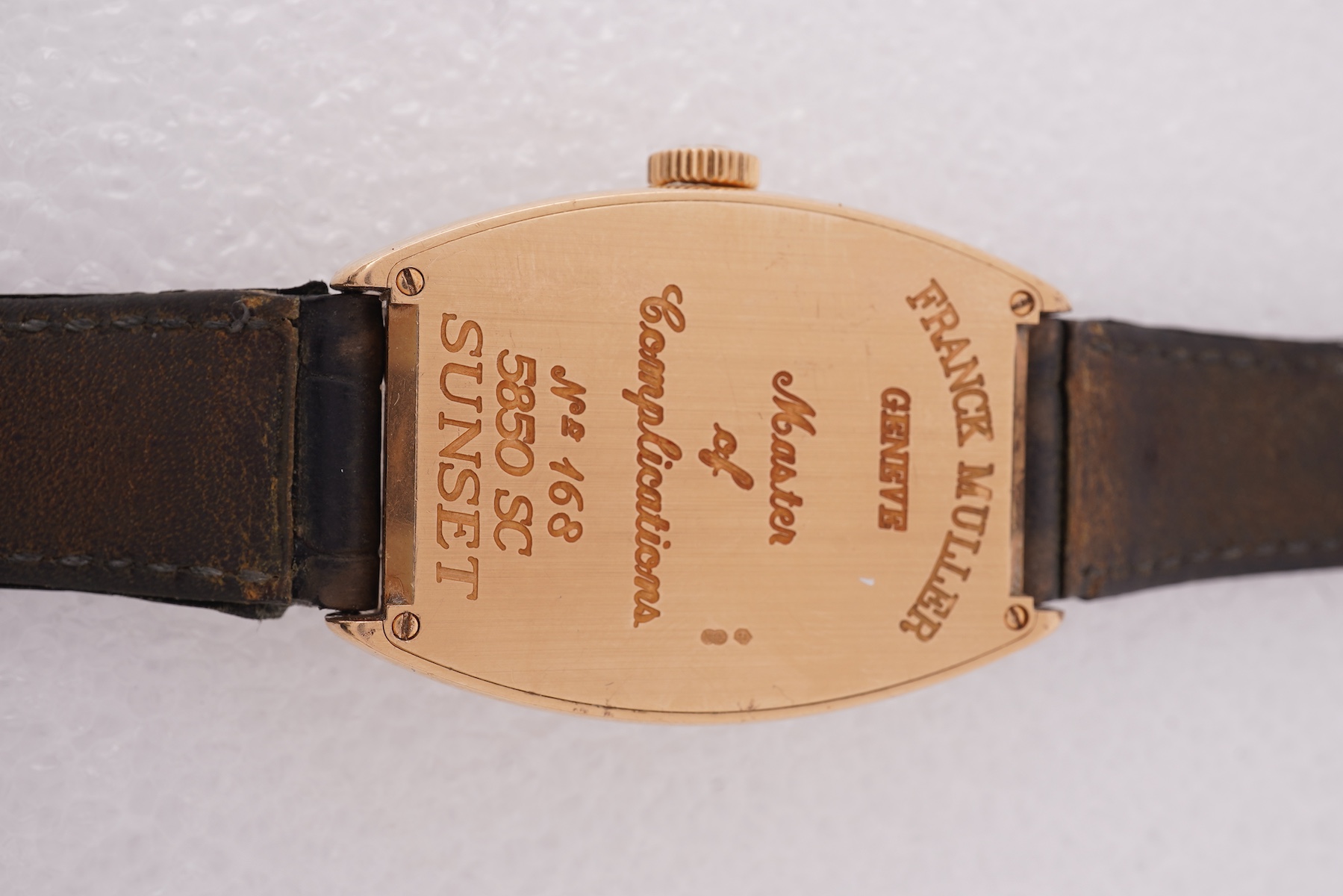 A gentleman's Swiss Franck Muller 18ct gold Sunset automatic wrist watch, ref.5850, circa 2010, with sunburst silvered dial and blue Arabic tumbling numerals, the tonneau shaped case engraved verso 'Franck Muller Geneve Master of Complications No. 168 5850 SC Sunset', case diameter 32mm, movement c.2800, on an unmarked leather strap with buckle stamped 750, gross weight 78 grams, no box or papers.