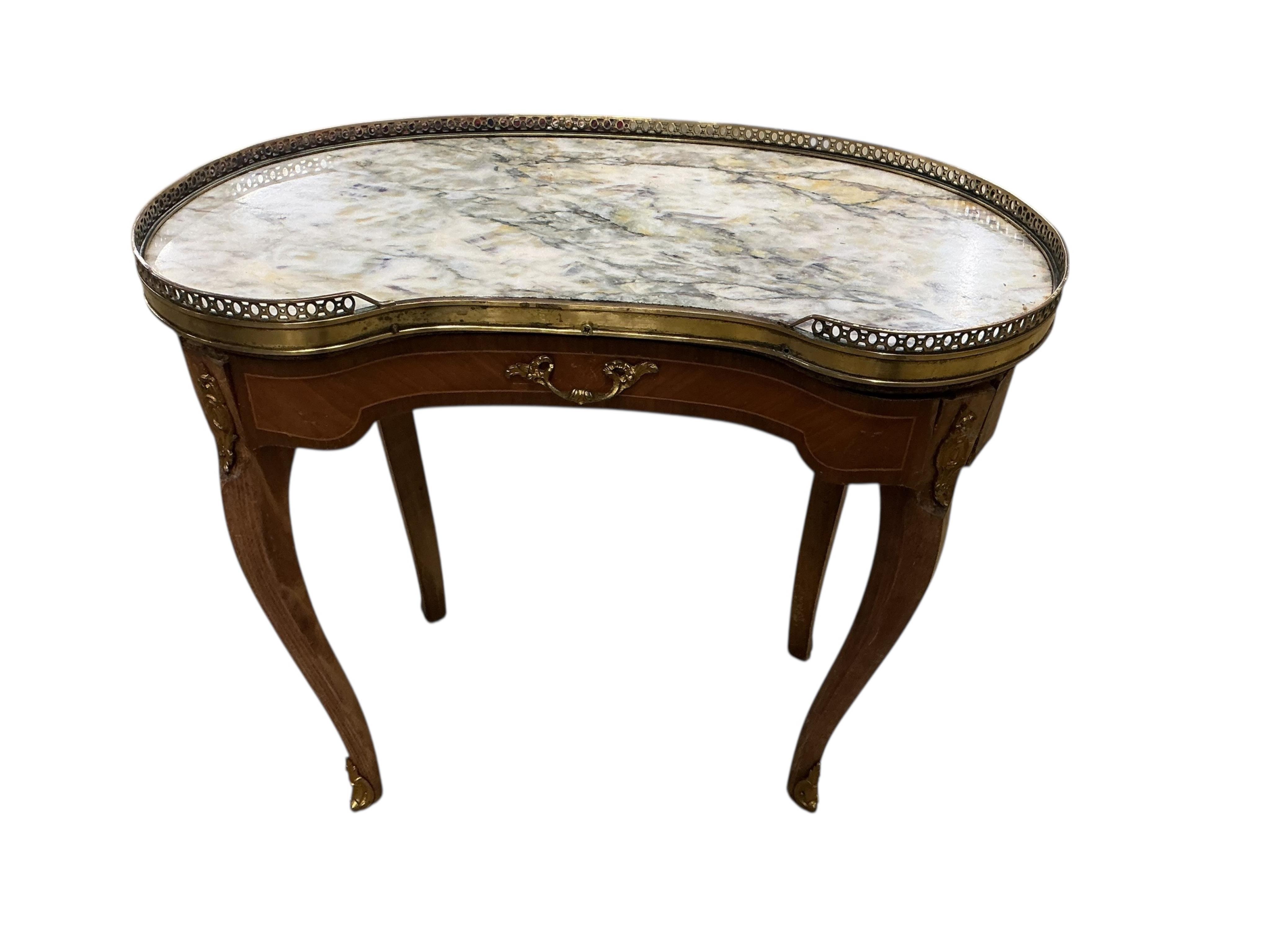 A pair of Louis XVI style gilt metal mounted kidney shaped marble top side tables, width 53cm, depth 29cm, height 46cm