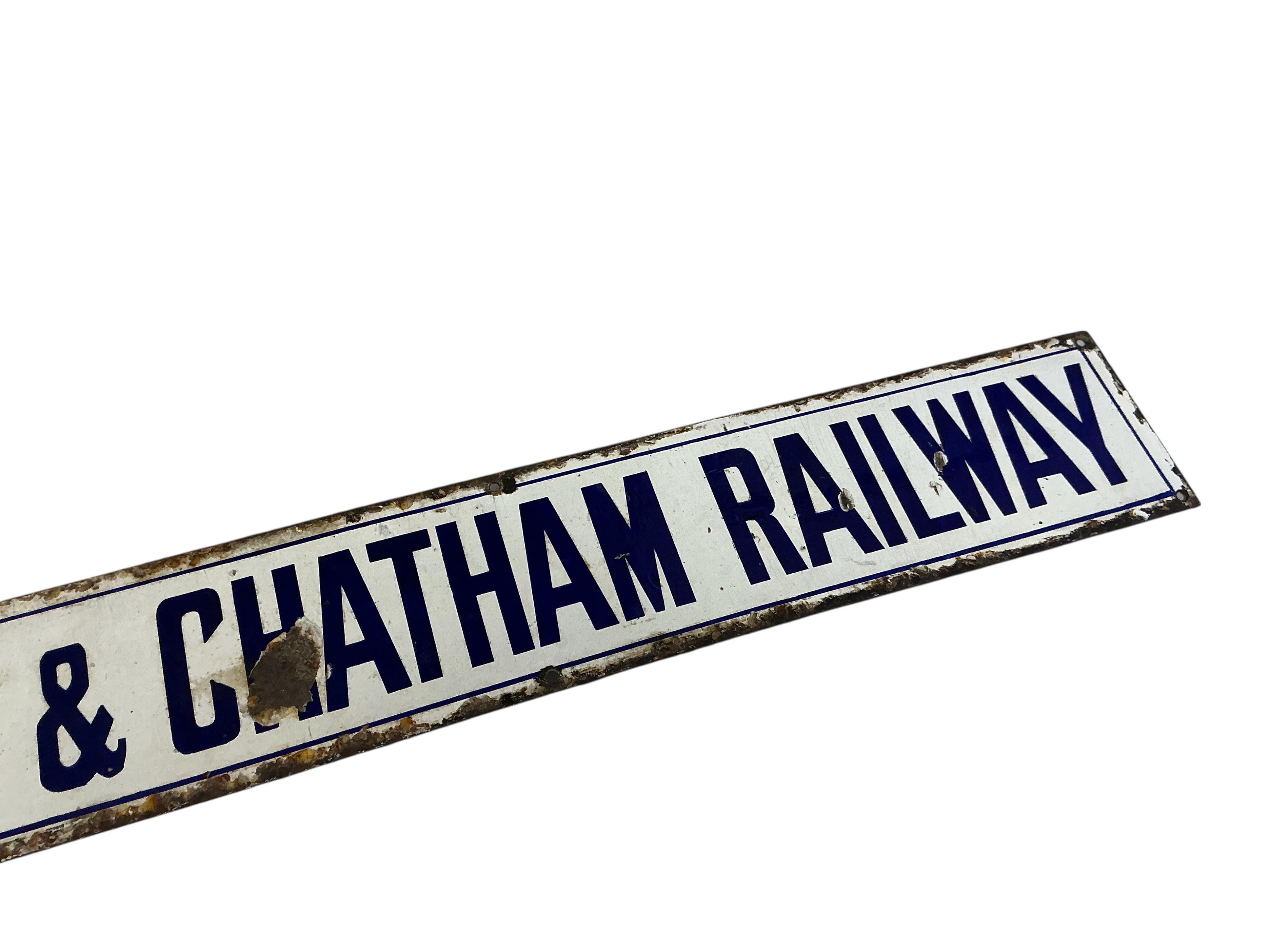 A SE&CR quad royal enamel station poster board heading; SOUTH EASTERN & CHATHAM RAILWAY, blue lettering on white ground, 105cm wide
