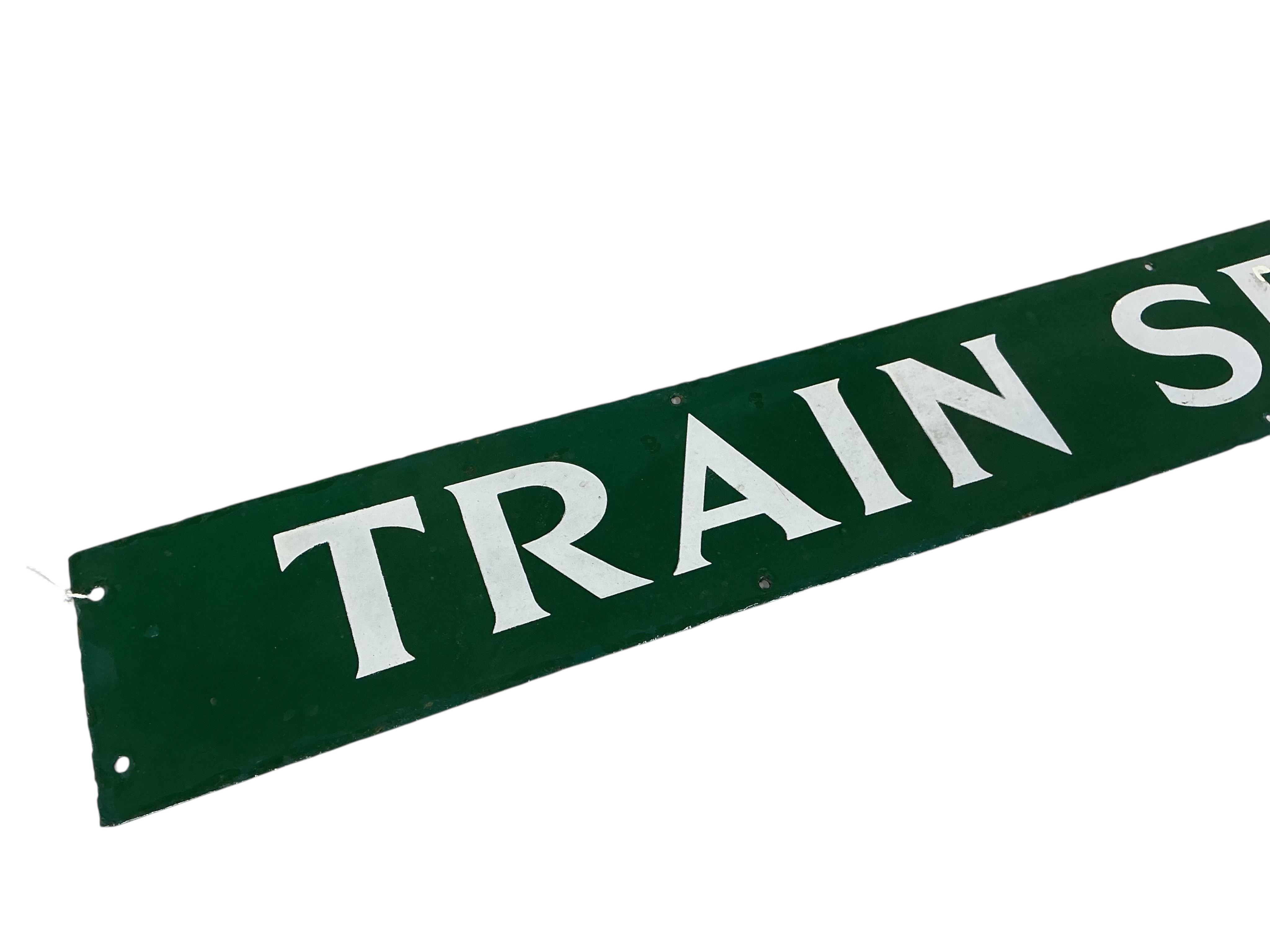 A Southern Railway enamel sign; TRAIN SERVICE, white lettering on green ground, 114cm wide, 12.5cm high