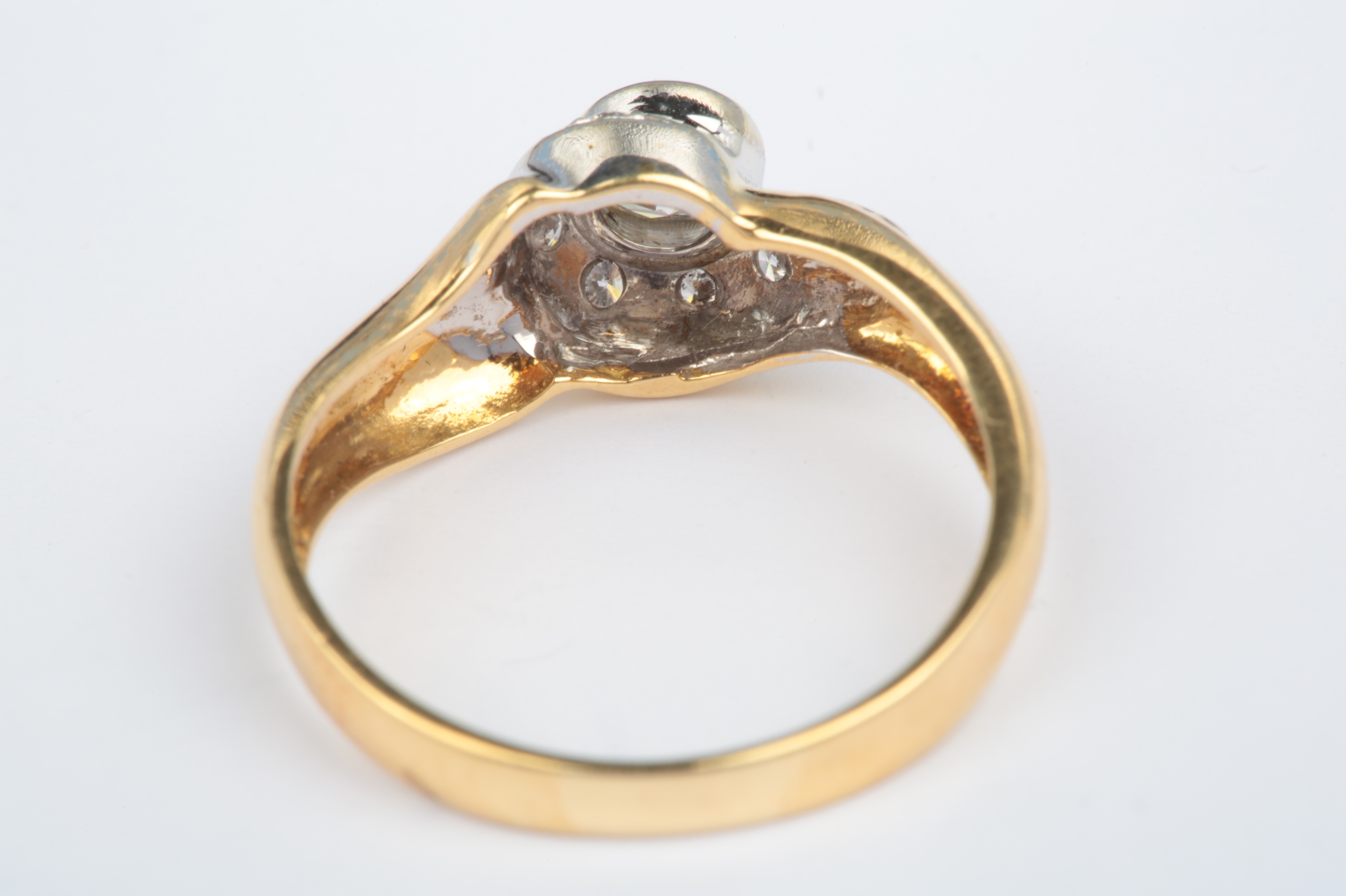 A diamond ring, collet-set with a brilliant-cut diamond weighing approximately 0.30 carats, within an asymmetrical scrolled mount set with smaller brilliant-cut diamonds totalling approximately 0.30 carats, mounted in 18ct gold, gross weight approximately 3.5 grams