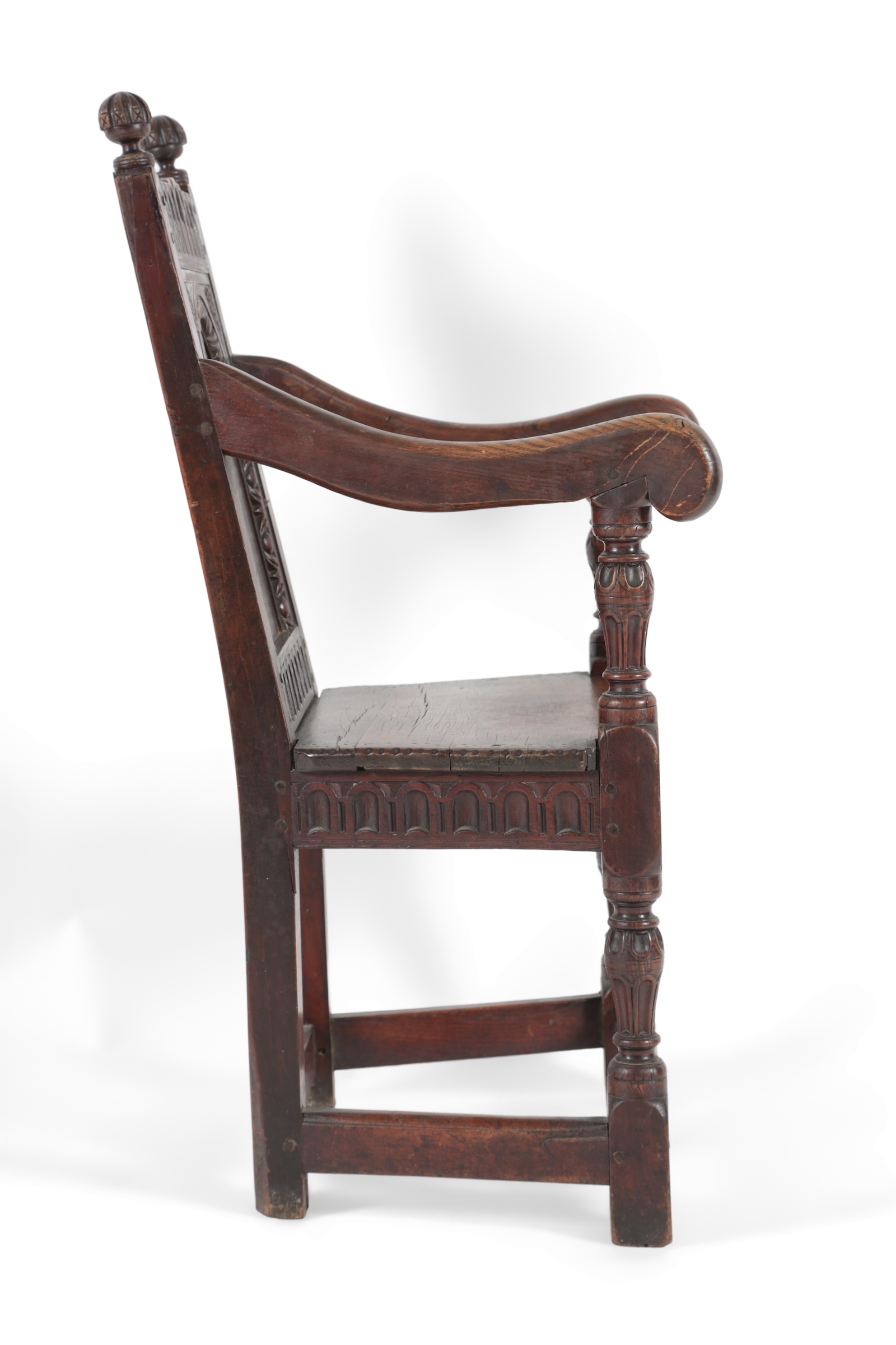 early 17th century, the Romanesque arched panel back carved with flowerhead spandrels above egg and dart, the back and seat rails with stop flutes or flutes, with upright fluted baluster front supports, the inset back panel and right arm scroll are later oak replacements, later finials, 54cm wide at the arms, 96.5cm high