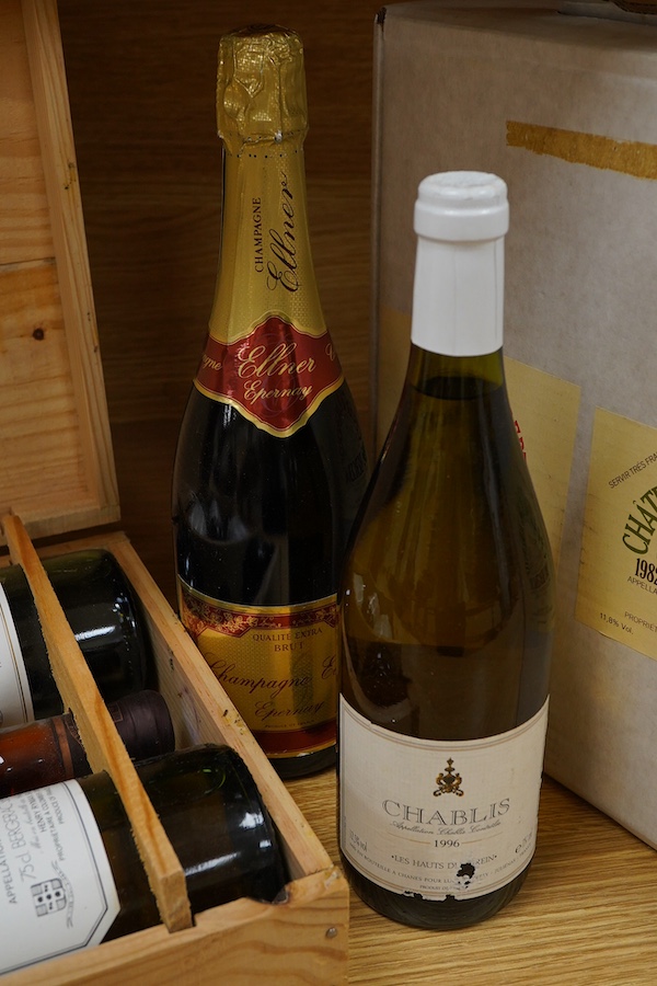 Chateau La Jaubertie, six assorted bottles, plus a bottle of Ellner champagne and a bottle of Chablis.