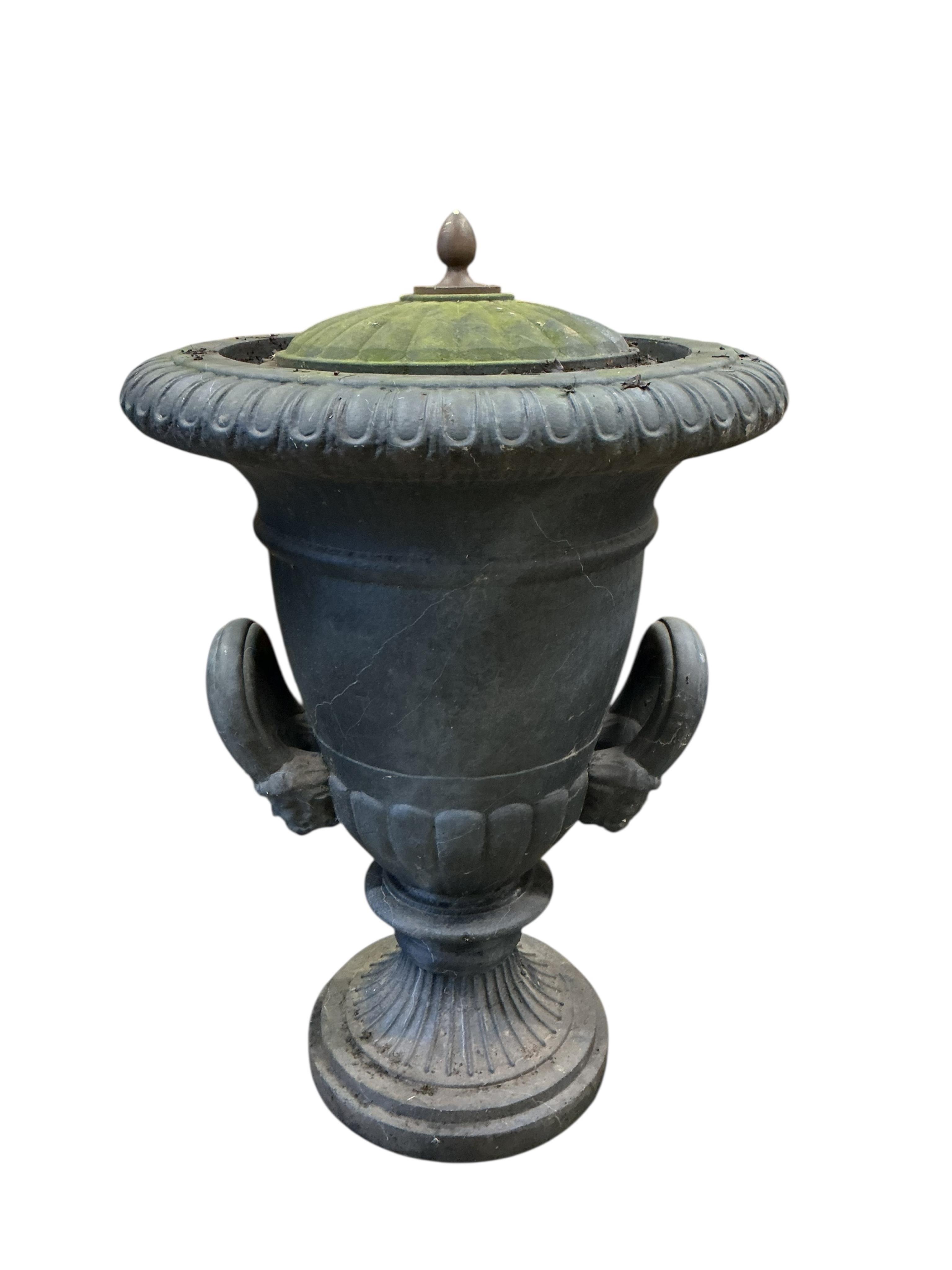 A pair of massive composite faux lead campana shaped urns and covers, diameter 100cm, height 140cm