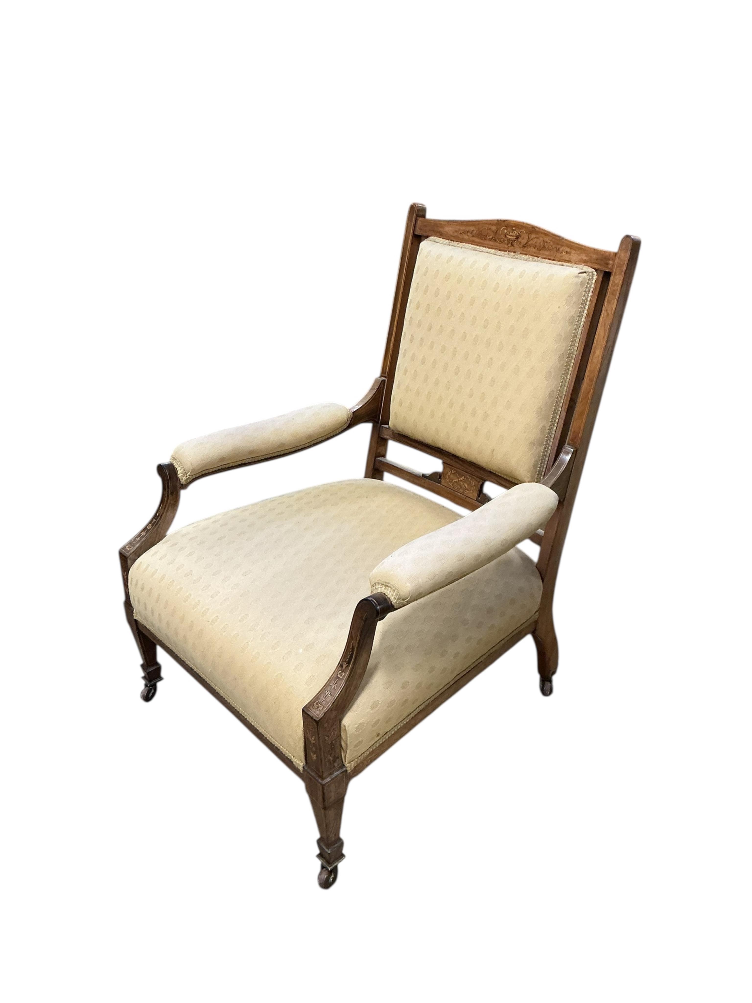 Lot 130 , A pair of Edwardian marquetry inlaid rosewood armchairs, width 70cm, depth 65cm, height 88cm