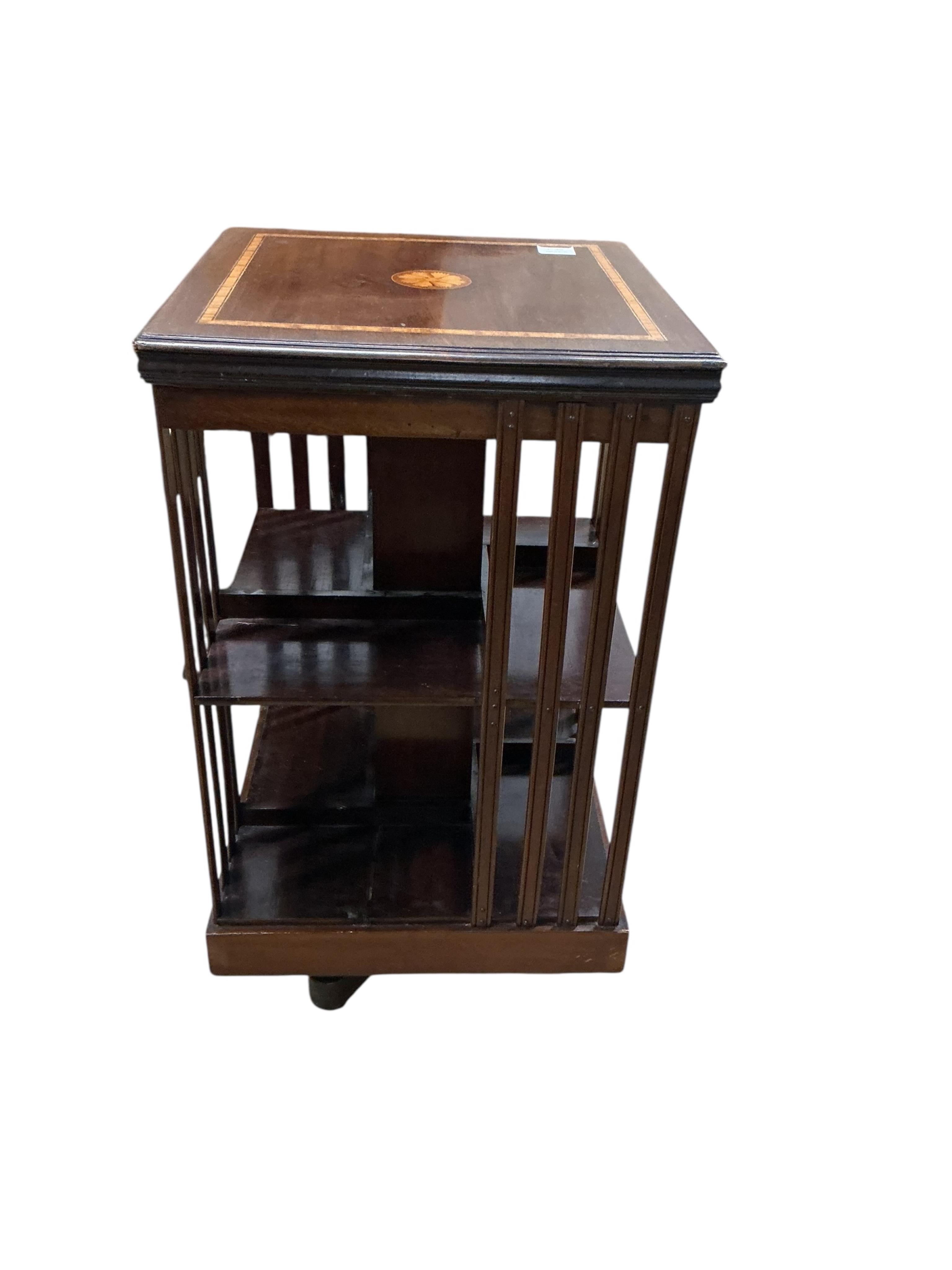 Lot 230 , An Edwardian marquetry inlaid satinwood banded mahogany revolving bookcase, width 46cm, depth 47cm, height 85cm