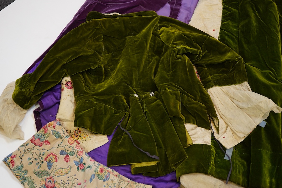 A 19th century green velvet and Spitalfield silk lady’s matching skirt and jacket, a purple velvet with appliqué cape (altered), a length of printed chintz etc, all items needing repair