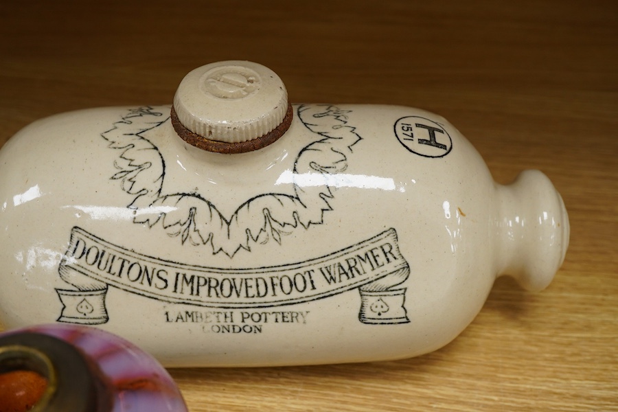 A pair of Royal Worcester figural sweetmeat dishes, a Continental figure group, 27.5 high, foot warmer and a cranberry glass oil lamp base,
