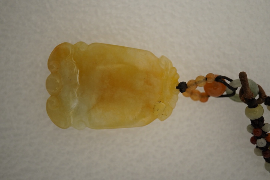 A jadeite pendant, China, 20th century, suspending a foliate yellow jadeite plaque pendant designed as an animal beneath a fruiting tree, to an adjustable cord necklace threaded with varicoloured jadeite beads and hoops, jadeite plaque 4.7 x 3.1cm