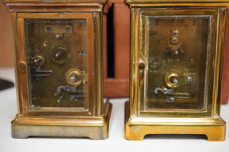 A French Armand Aubert carriage clock, with bell and Arabic number dial, cased, together with another brass cased carriage timepiece, each with keys, 14cm high