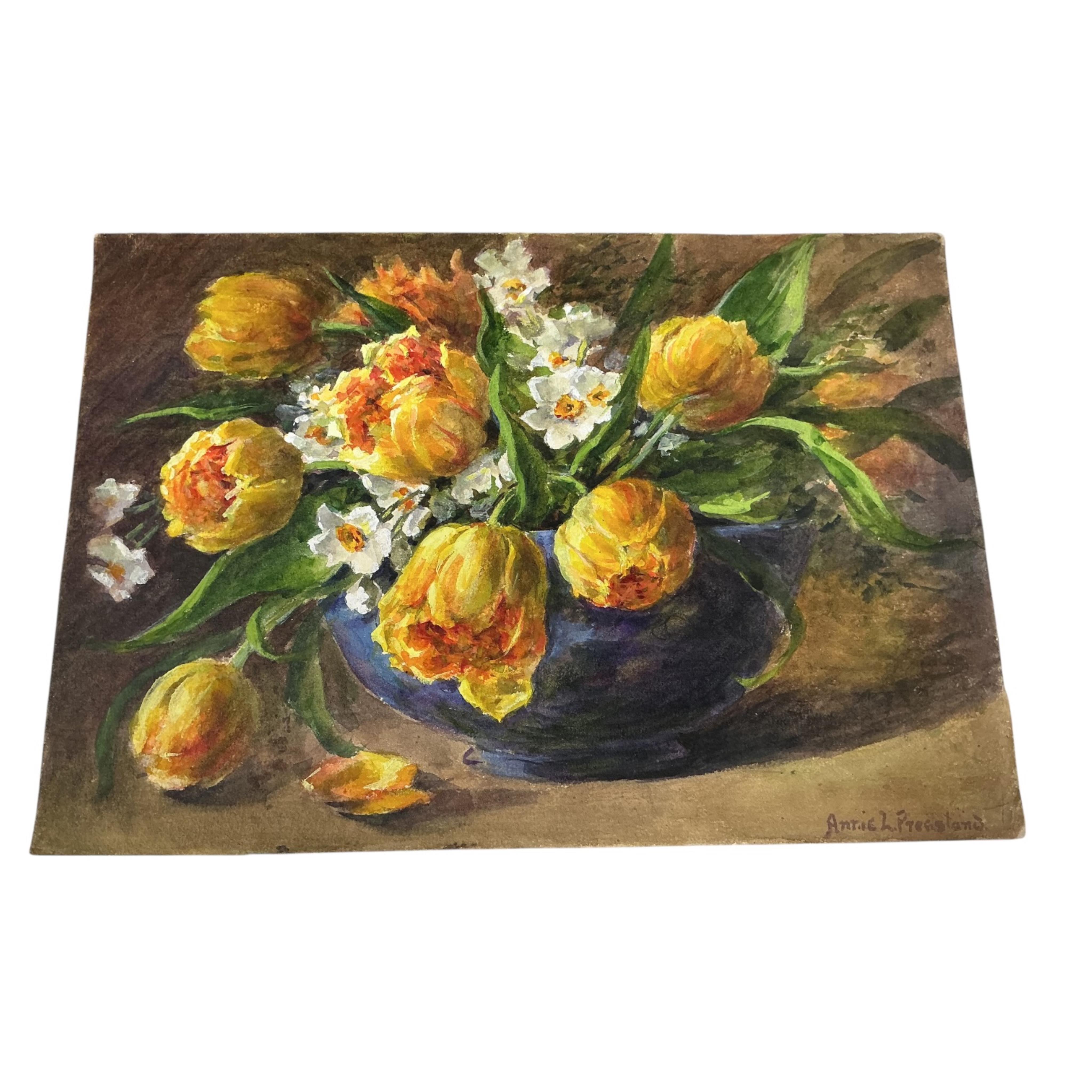 Lot 1751 , Annie Louise Pressland (1862-1933), spring flowers to include ‘Snowdrops & Violets’ and ‘Daffodils and Mimosa’, two signed, four watercolours on card, unframed, largest 18 x 26cm