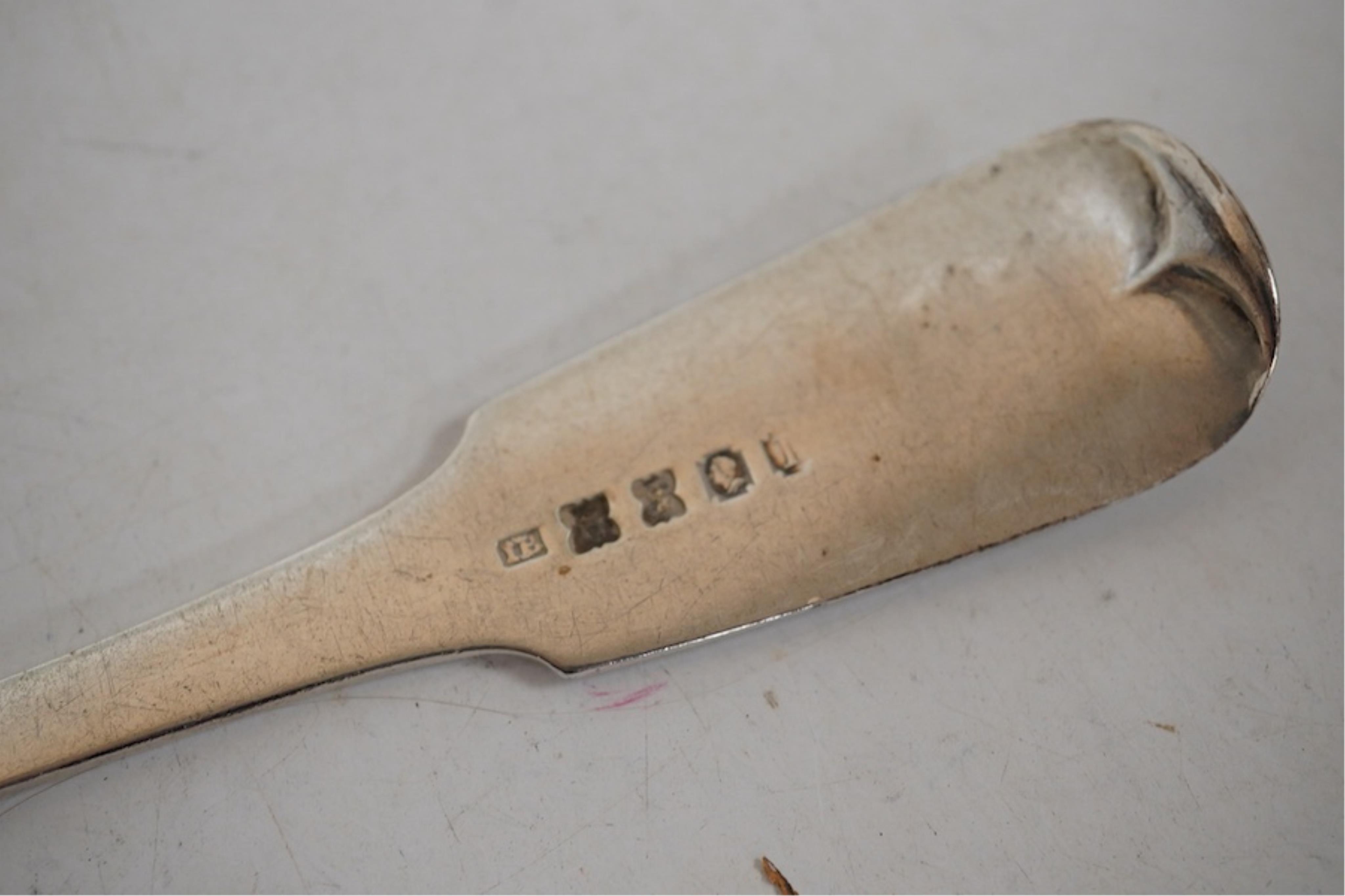 Lot 1040 , A set of six George IV Irish silver fiddle pattern table spoons, by James Brady, Dublin, 1829, 23.5cm, 14.1oz.