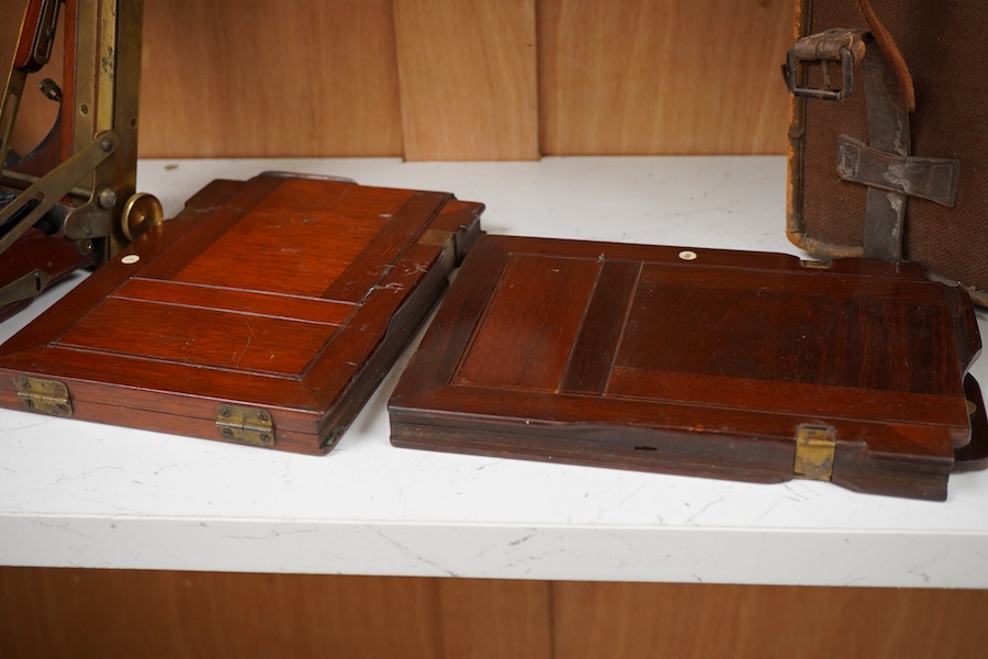 A late Victorian mahogany and brass-mounted plate camera, in canvas case, plate holders 21x15cm