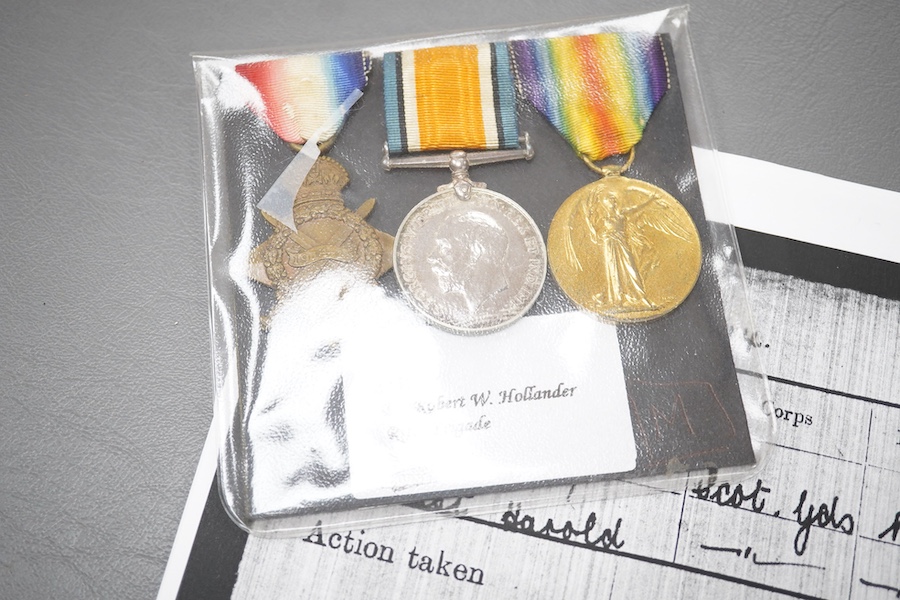 Two First World War medal trios;, 7696 Ernest Harold Domoney, Scots Guards with research from the Nation Archives, together with S1378 Pte. Robert W. Hollander, Rifle Brigade