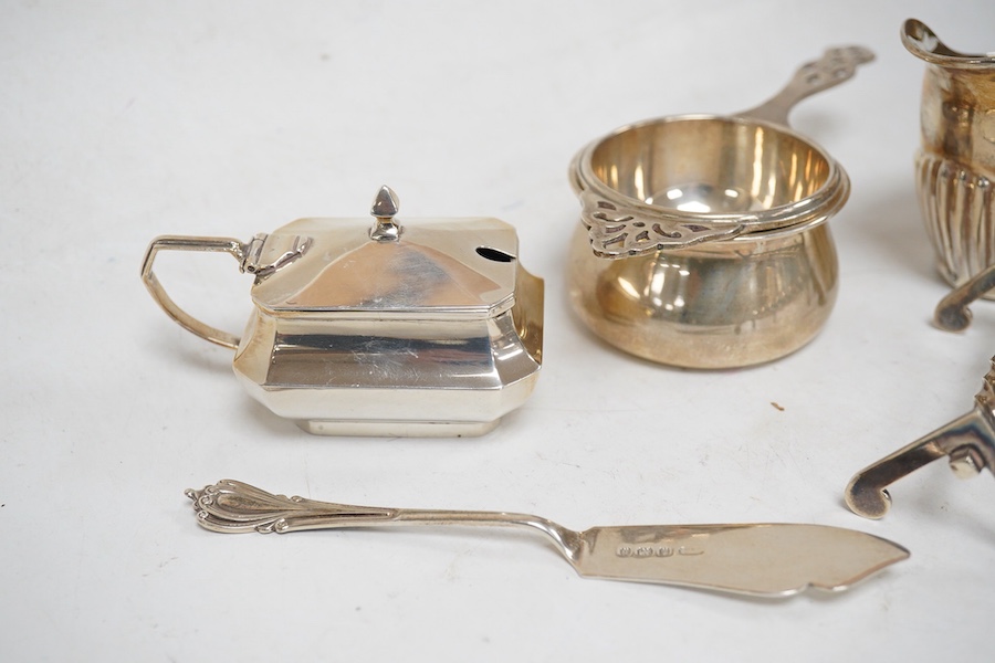 Sundry small silver including a late Victorian demi-fluted cream jug, Nathan & Hayes, Birmingham, 1894, a 1930's tea strainer on stand, a George V mustard pot with blue glass liner and a butter knife, together with a pair of sterling knife rests.