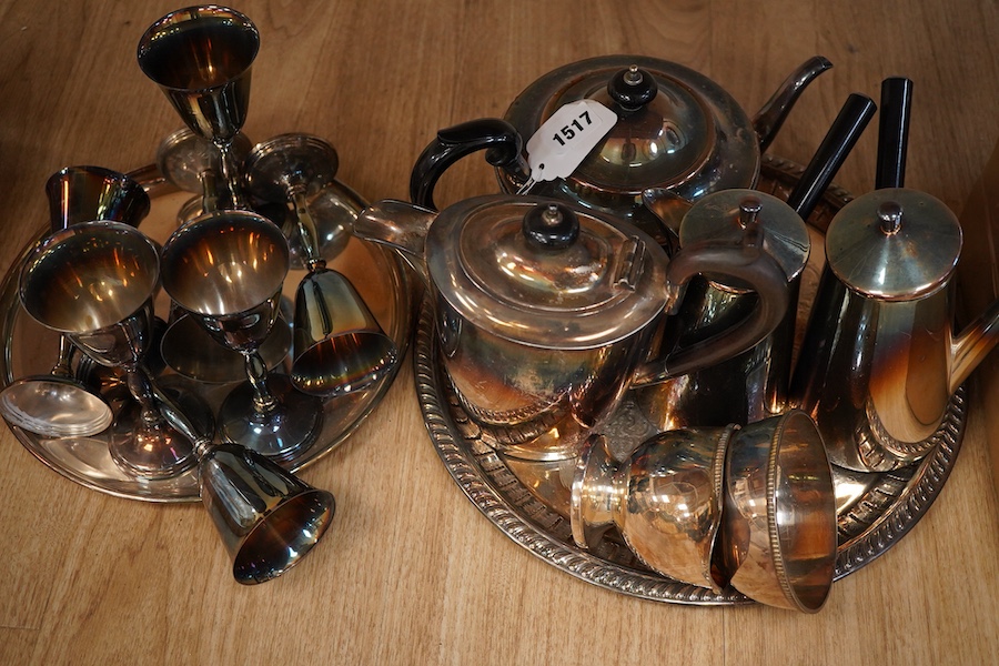 Lot 1517 , A collection of silver plate to include flatware, a set of goblets and a novelty glass and silver plated pot in the form of an apple
