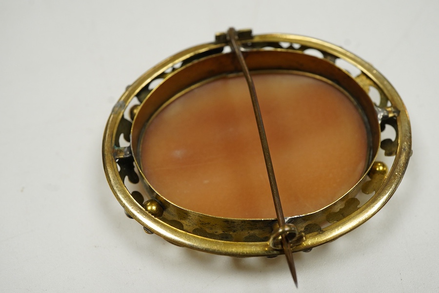 Lot 924 , A cased Victorian gilt metal mounted oval cameo shell brooch, carved with the scene of a lady and gentleman beneath a tree, 57mm.