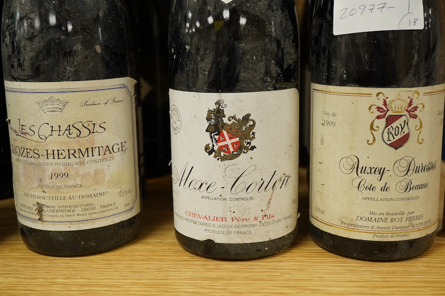 Eighteen assorted bottles of wines and spirits including Auxey-Duresses, 1999 and Aloxe-Corton, 1989, Auchentoshan 12 year old malt whisky, Glenmorangie Highland Single Malt and Johnnie Walker Black label.