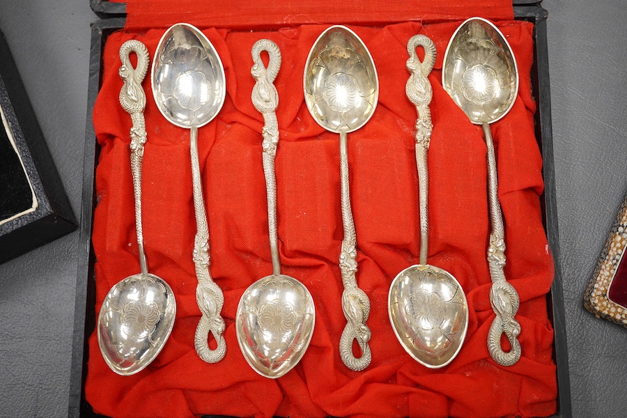 An early to mid 20th century cased set of six Hong Kong white metal teaspoons, with serpent terminals, together with a cased set of six plated teaspoons and a similar christening spoon and egg cup.