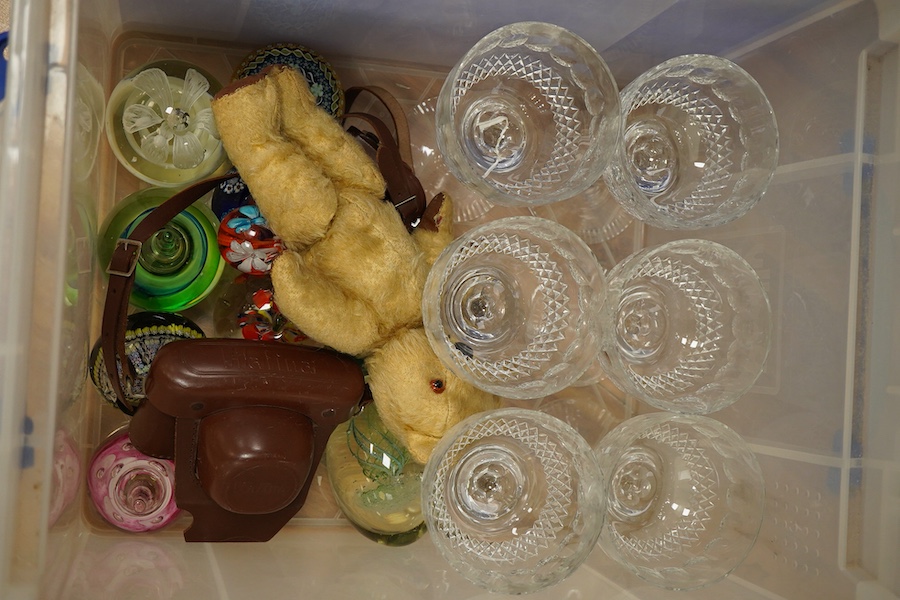 Miscellaneous china, a set of six cut glass wine goblets, paper weights, a Beswick pig and piglet group dog- 18cm