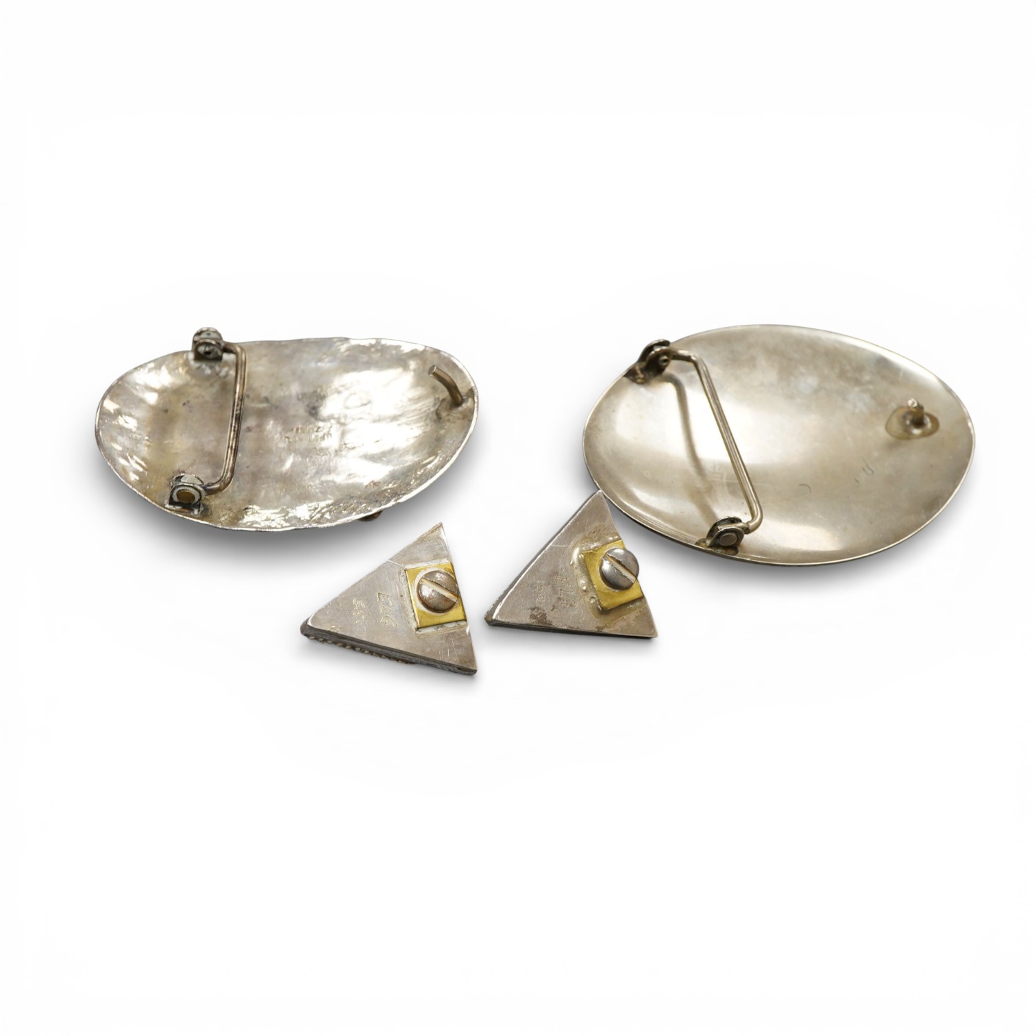 Two Native American white metal turquoise and coral Navaho belt buckles, largest 9cm, one buckle signed Effie C Zuni and two belt caps.