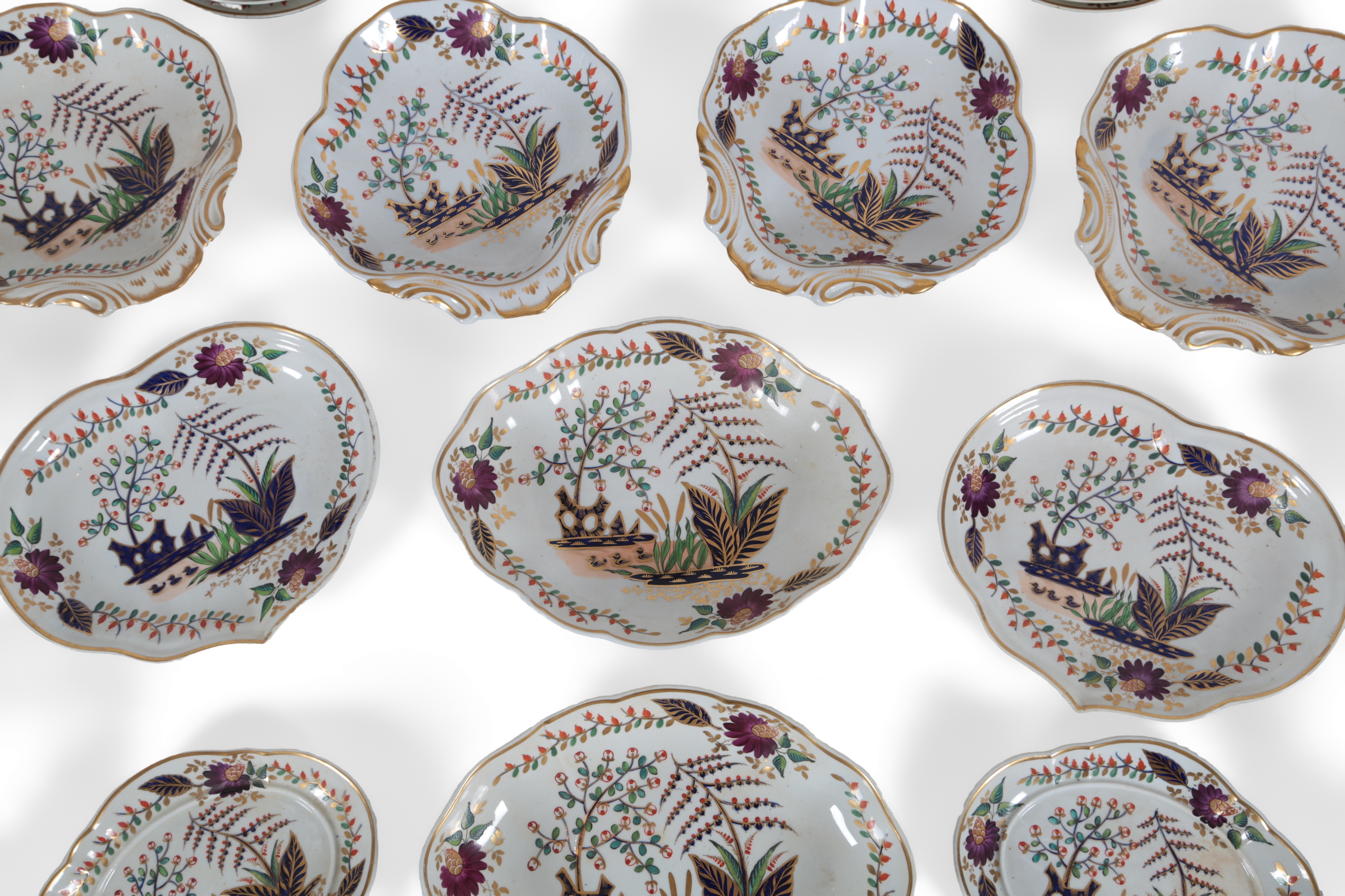 comprising a pair of sauce tureens and covers, 17.5cm wide, and stands, a rectangular footed dish, 29cm wide, a pair of kidney-shaped dishes, four leaf shaped dishes, six lozenge shaped dishes, in two sizes, and twenty four plates, complete with early 20th century inscribed inventory stating that the service was given to J H Streatfield of Chiddingstone by the Countess de Baillet in 1913