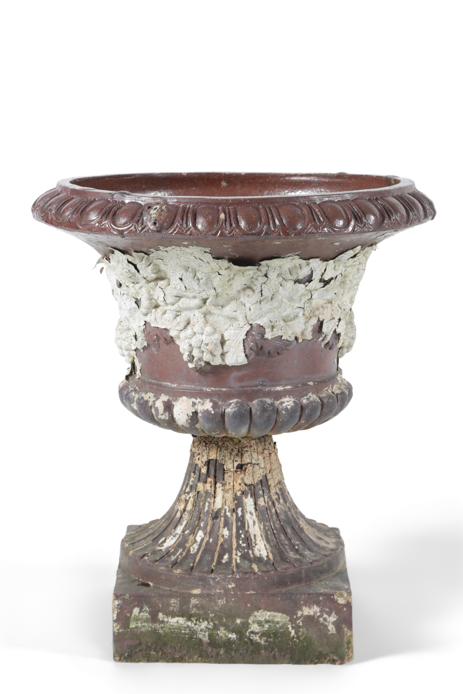 A pair of Victorian salt glazed stoneware Campana shaped garden urns, the vineous moulded bodies on square plinth bases, bears traces of later paint, 56cm diameter, 64cm high