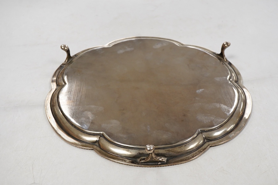 A George V silver salver, of cusped circular form, on three feet, by Fenton Brothers Ltd, Sheffield, 1933, diameter 25.7cm, 19oz.