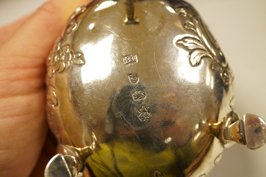 A George III silver sauceboat, by IS & AN, London, 1767, with later embossed decoration, length 12.2cm, 97 grams.