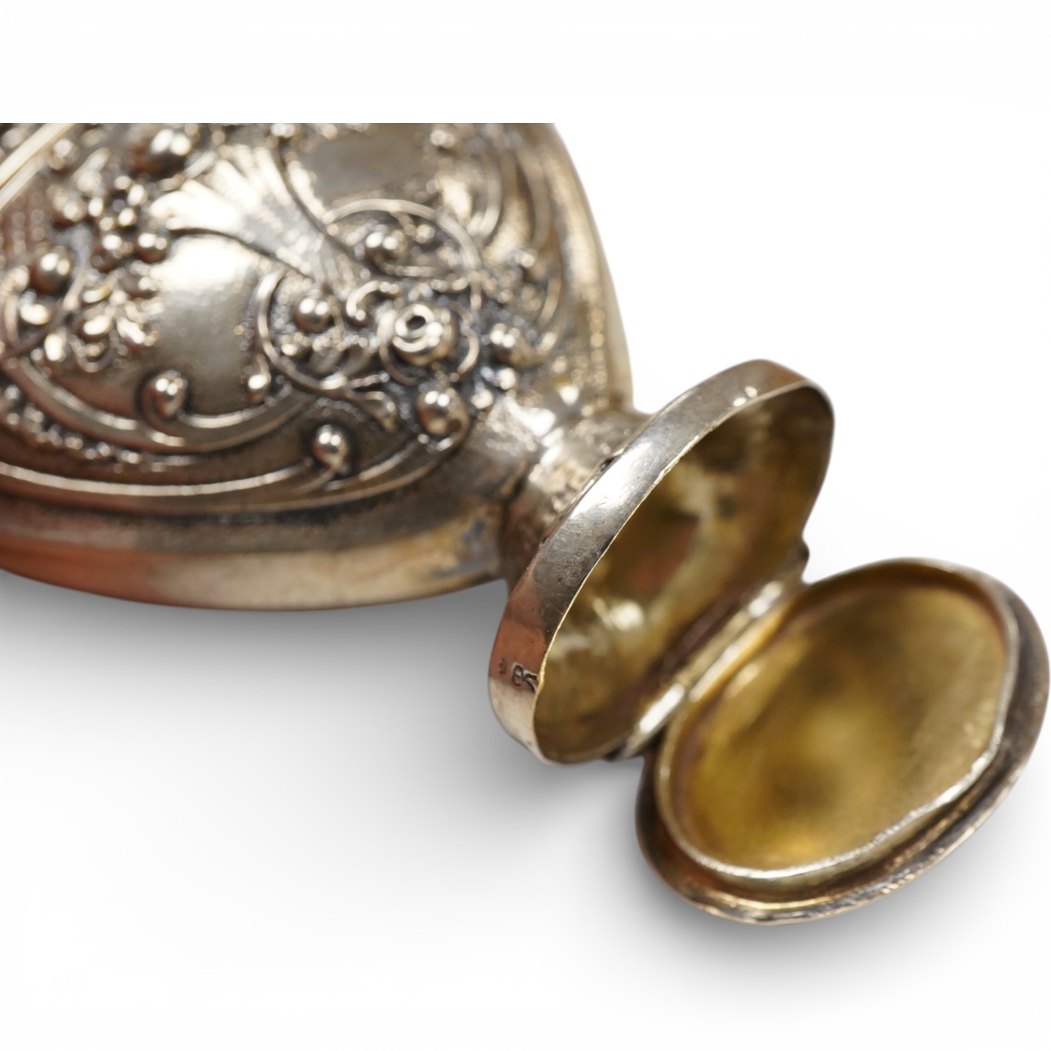 Lot 827 , A late 18th/early 19th century Scandinavian white metal heart shaped Hovedvandsaeg (vinaigrette), unmarked, 86mm.