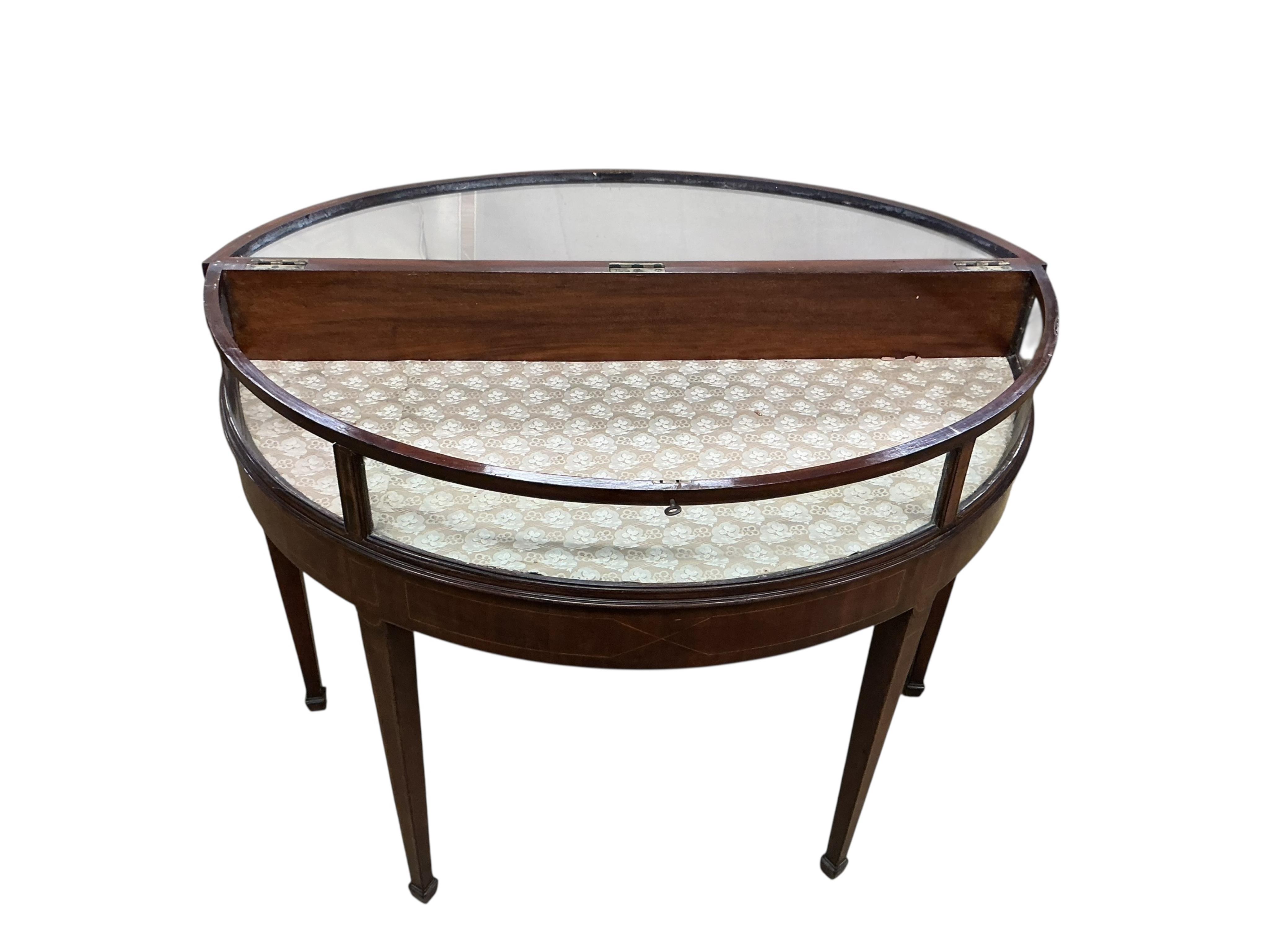 A George III demi lune mahogany bijouterie table, width 114cm, depth 53cm, height 85cm