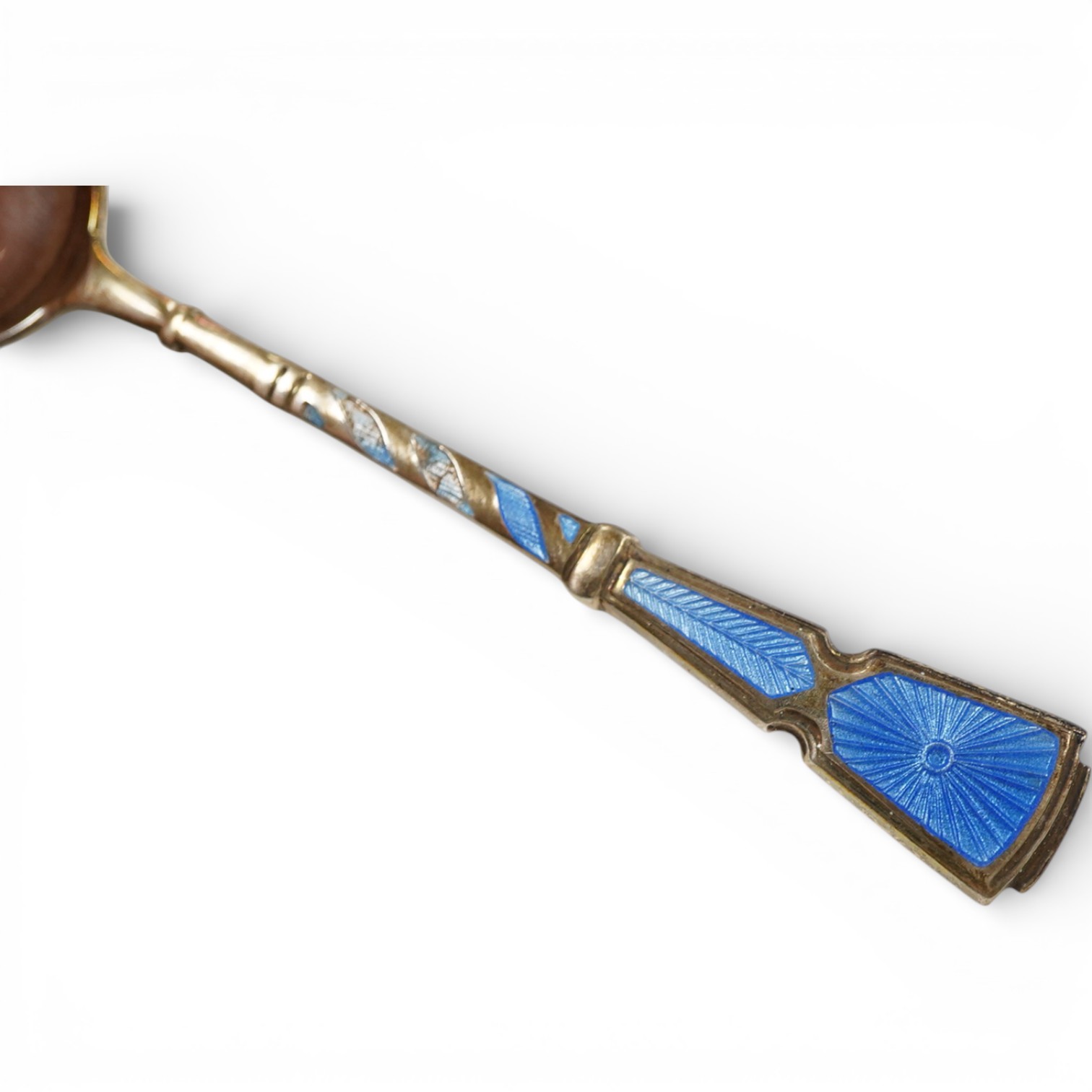Lot 857 , A cased set of six George VI silver and enamel coffee spoons, Turner & Simpson, Birmingham, 1947, 94mm.