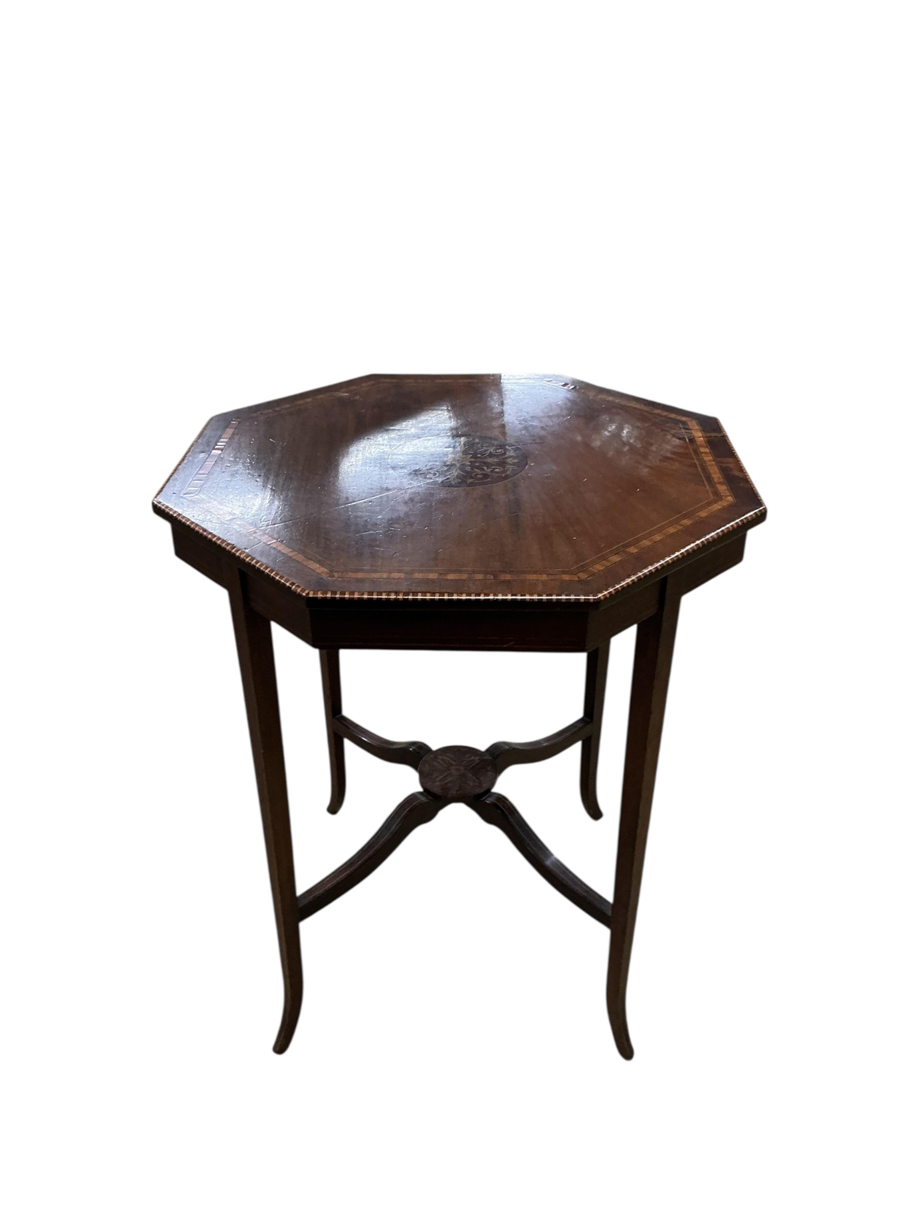 An Edwardian inlaid satinwood cross banded octagonal occasional table, width 60cm, height 70cm