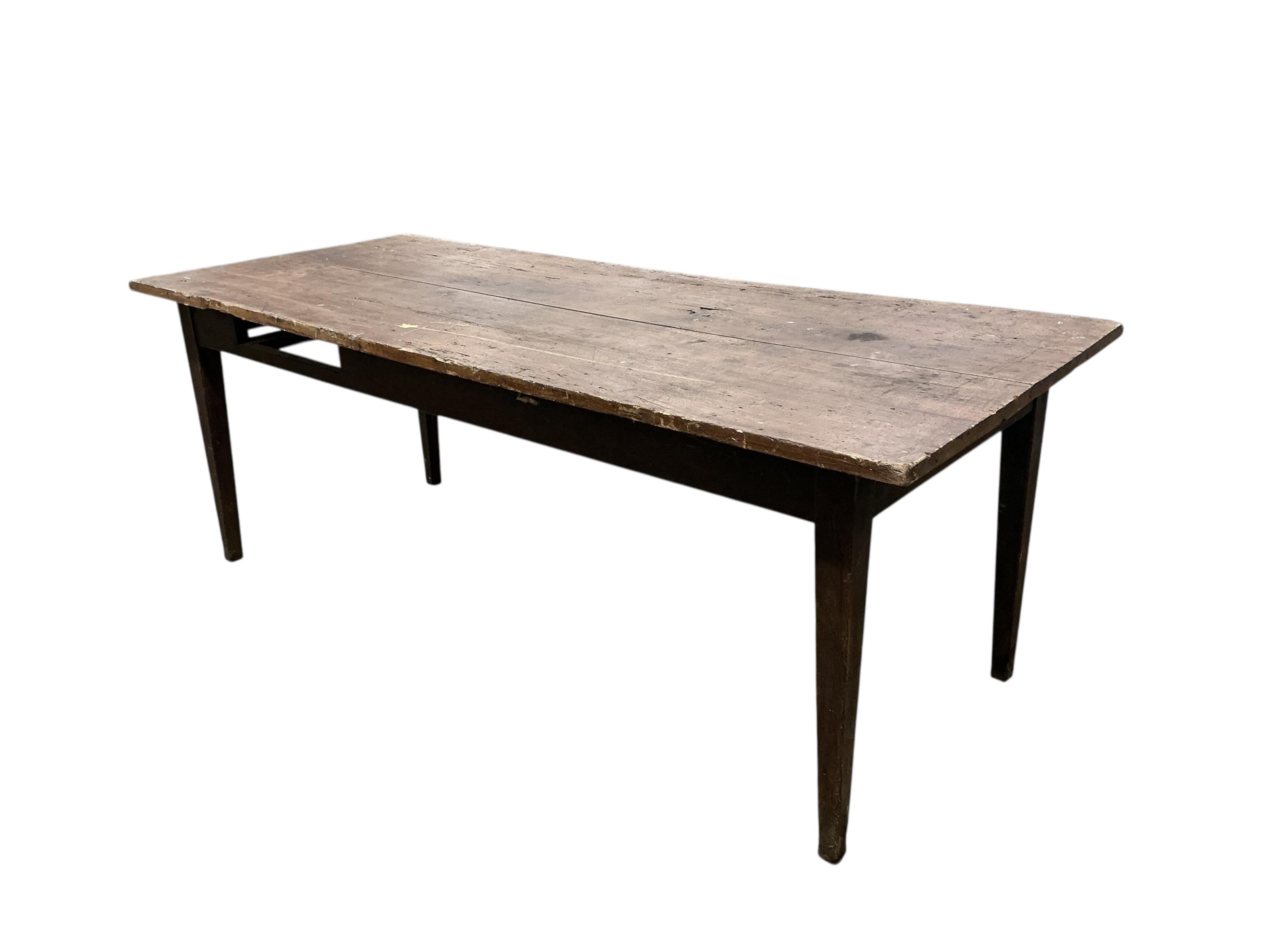 Lot 209 , A 19th century French rectangular oak and fruit wood kitchen table, lacking drawer, width 200cm, depth 82cm, height 74cm