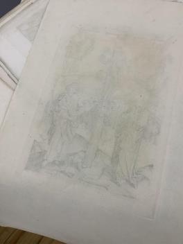 Durand, Amand (publisher) 69, Rue du Cardinal Lemoine, Paris - Reproductions of Ancient Engravings. Issued in illustration of Professor Colvin’s Lectures on “The Painter-Engravers of Italy and the North, 1450–1550;”. A collection of unframed engravings, 17 [of 41], circa 1880, consisting:- 1. Virgin and Child enthroned within a Gothic chapel: on one side an angel, on the other a monk holding an episcopal crozier; below, a male and female pilgrim kneeling; above, behind a traceried parapet, the three Persons of the Trinity with a choir of angels. Composition designed in honour of the Virgin of Einsiedeln, a famous place of pilgrimage in Switzerland. Signed with the Gothic initial E and the date 1466. By the master “E. S.”; probably of the Swabian (Upper Rhenish) School.