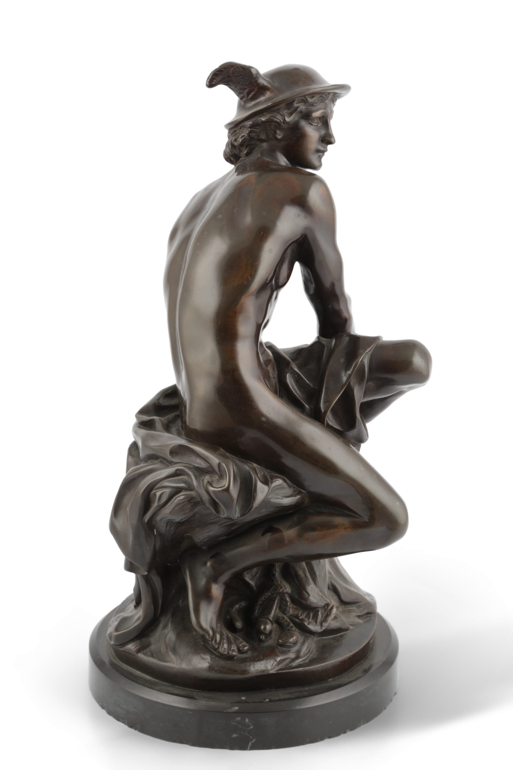 After Jean-Baptiste Pigalle (1714-1785). A bronze figure of Mercury, the figure seated on a rock, on a Belgian black slate circular plinth, unsigned, 42cm high