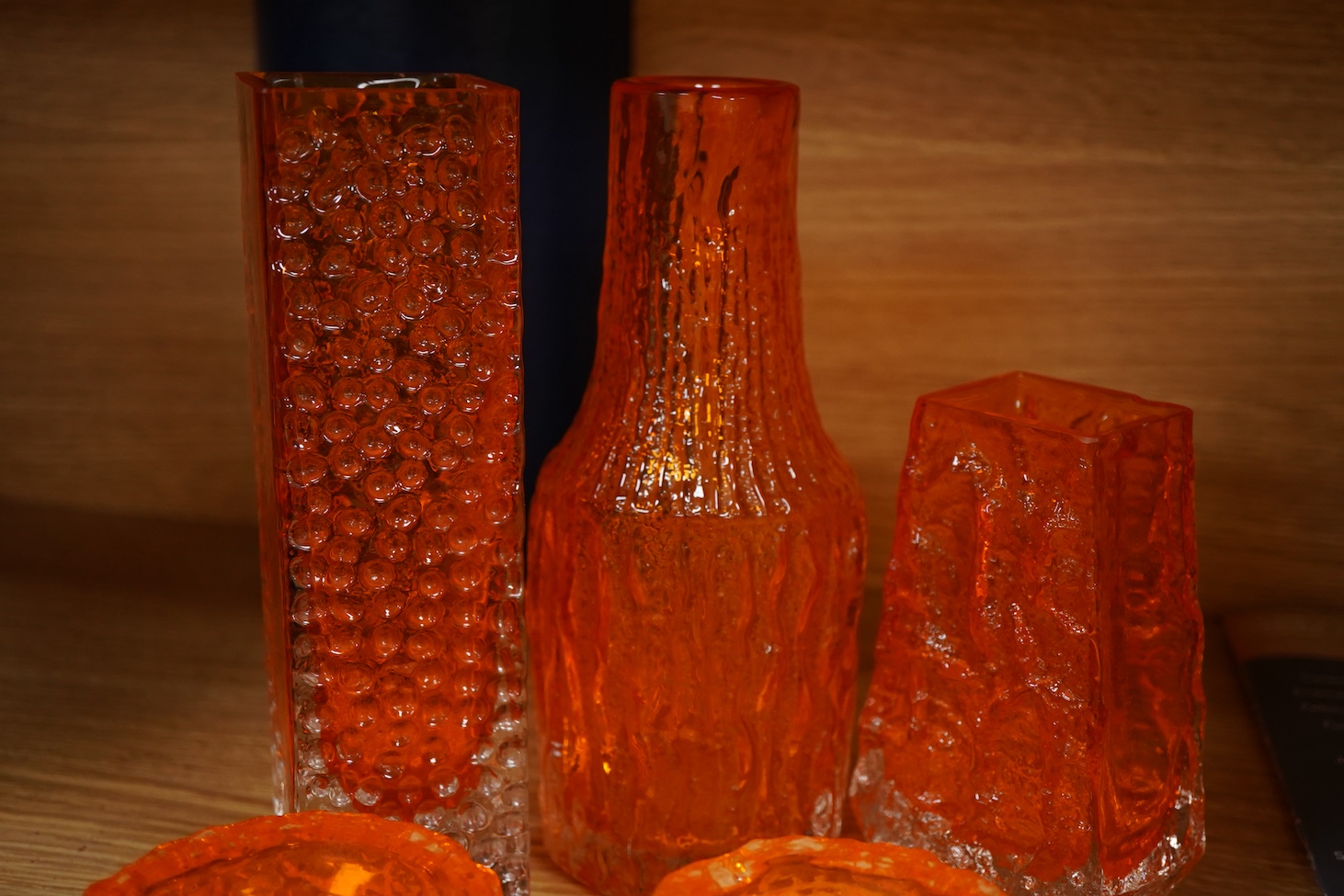 Geoffrey Baxter (1922-1995) for Whitefriars, five pieces of tangerine glass comprising three vases and a pair of candlesticks, largest 20cm high.