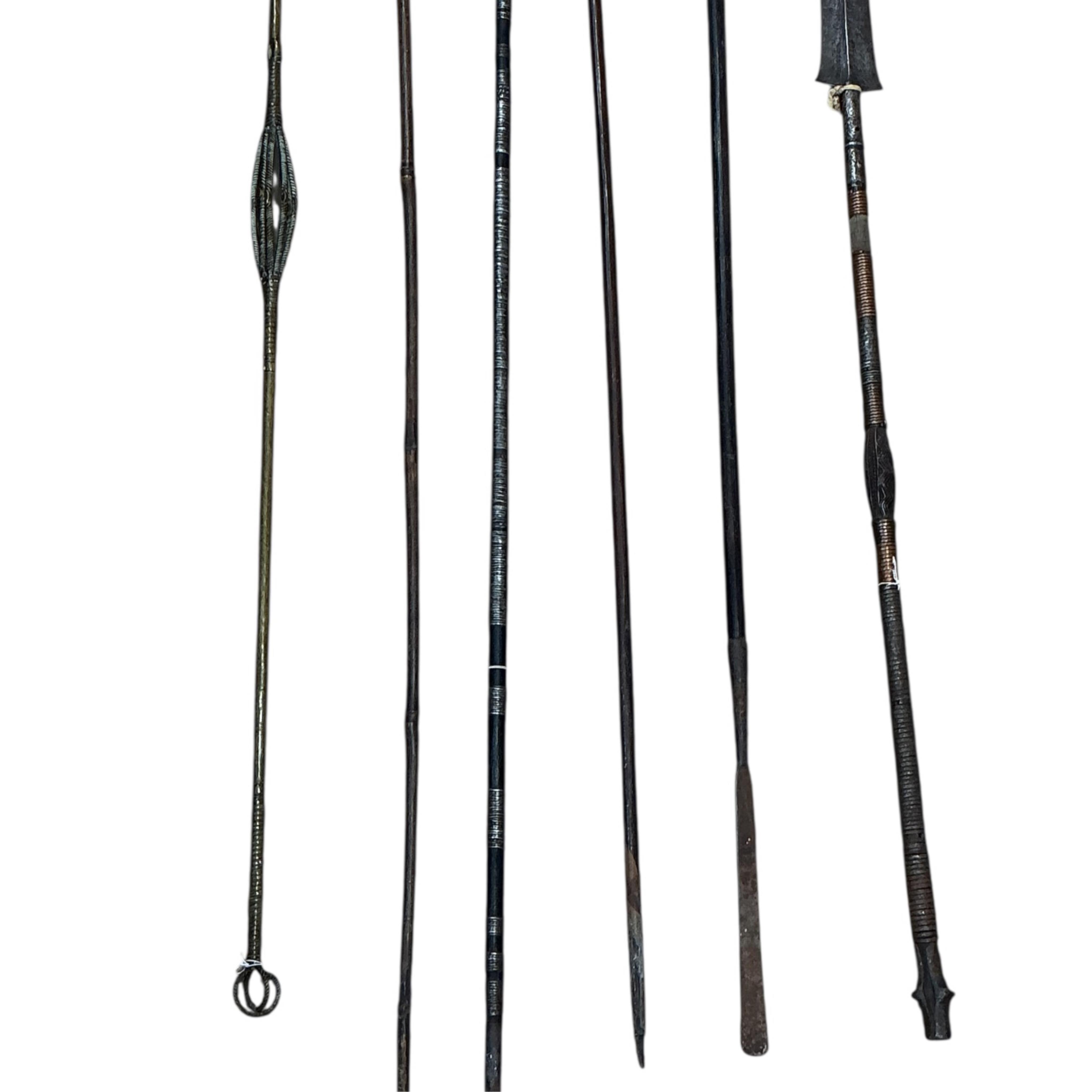 A Ngombe spear, Democratic Republic of Congo, four African Spears and a metal tipped staff (6)