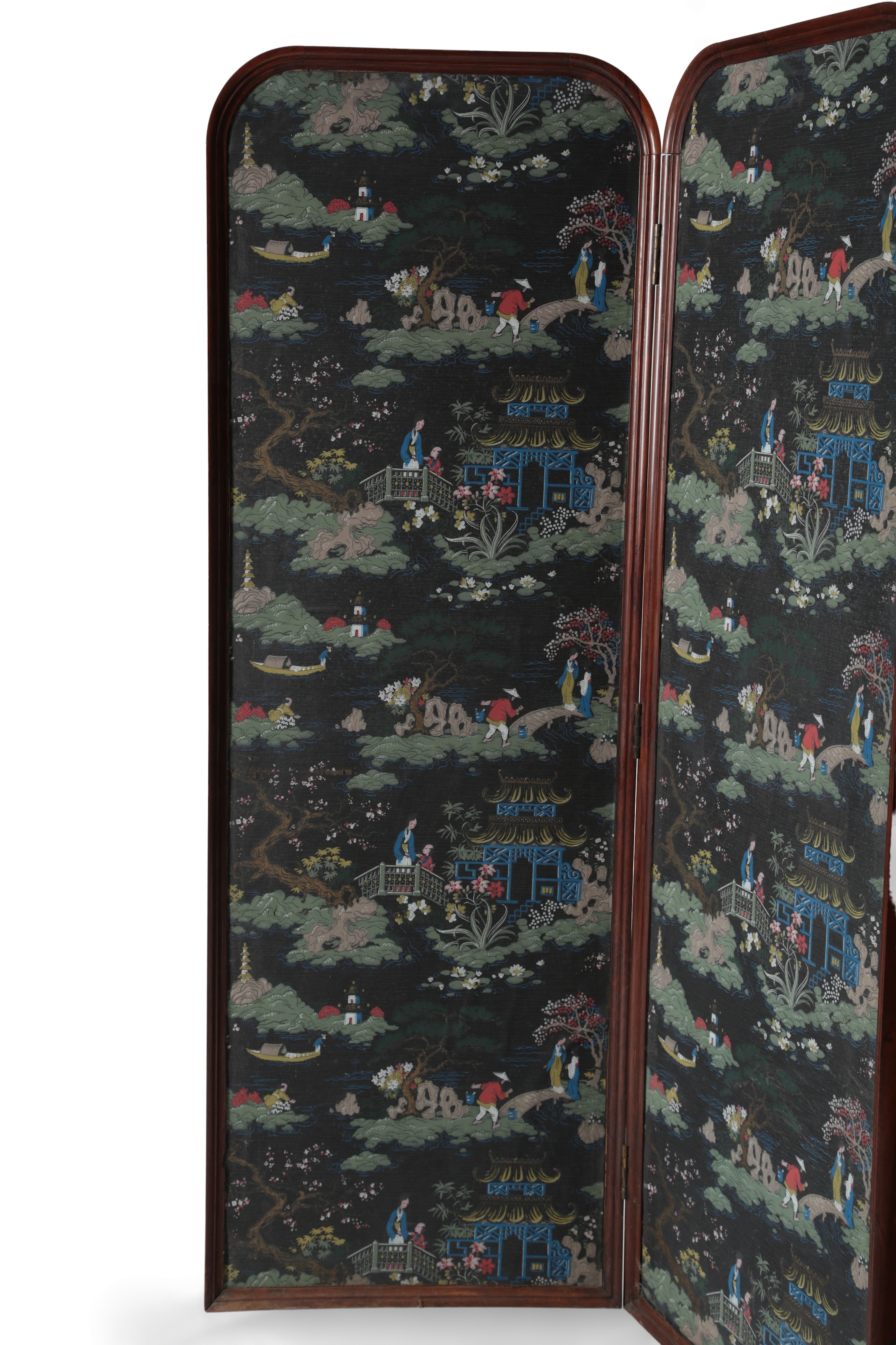 the frames inset with stencilled designs on paper of Chinese figures in river landscapes, 171cm wide fully extended, 167cm high