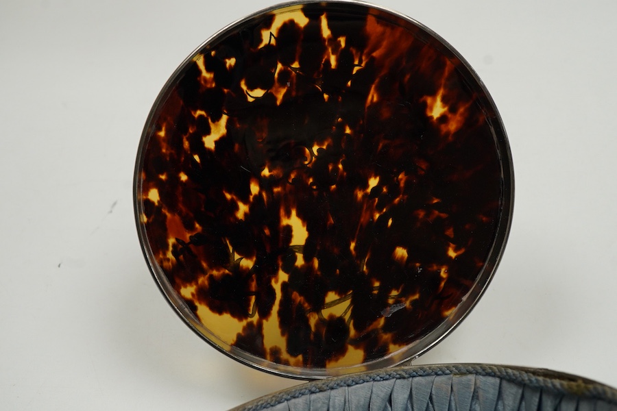 Lot 869 , A large George V silver and tortoiseshell pique mounted circular trinket box, on four paw feet, Charles Boyton & Son Ltd, Birmingham, 1912, diameter 13cm.
