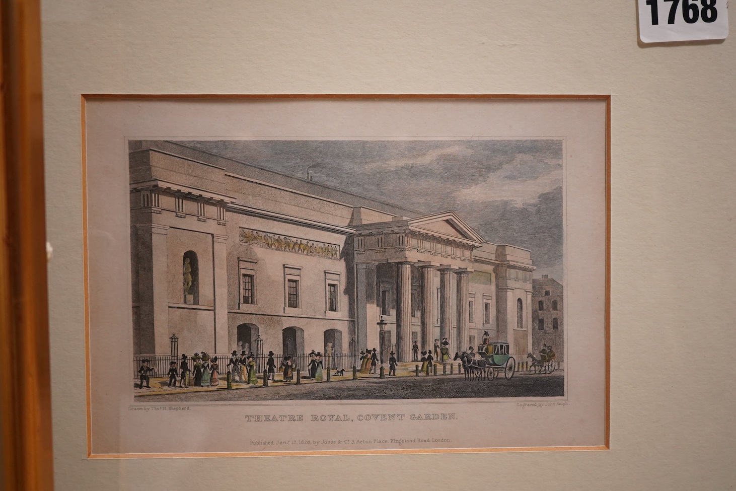11.5cm x 16cm and After Thomas Hosmer Shepherd (1793-1864), ‘Theatre Royal, Covent Garden’ handcoloured engraving, 13cm x 18cm (3)