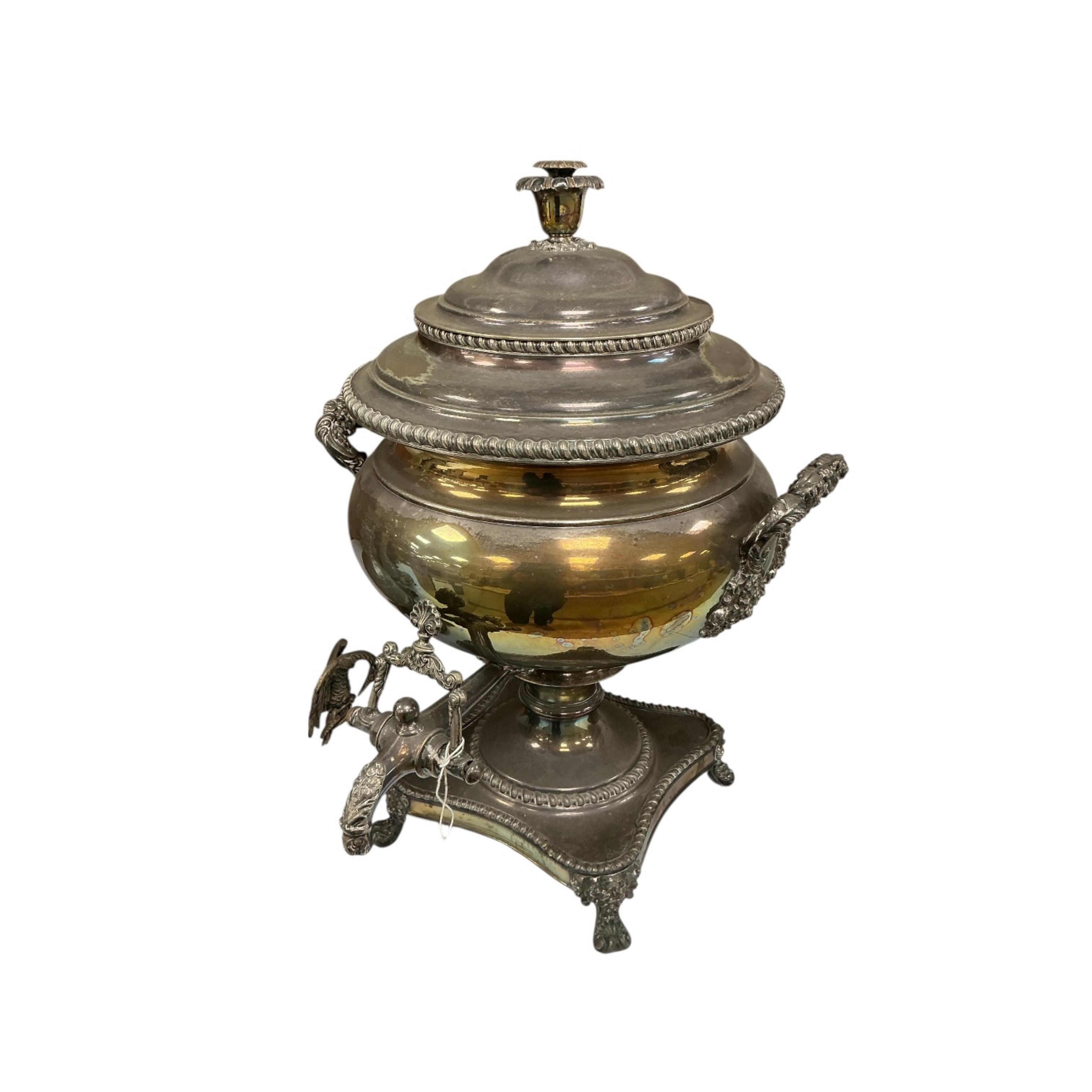 Lot 1500 , A pair of Victorian silver plated urns and a two bottle decanter stand with a pair of cut glass decanters, largest each 44cm high