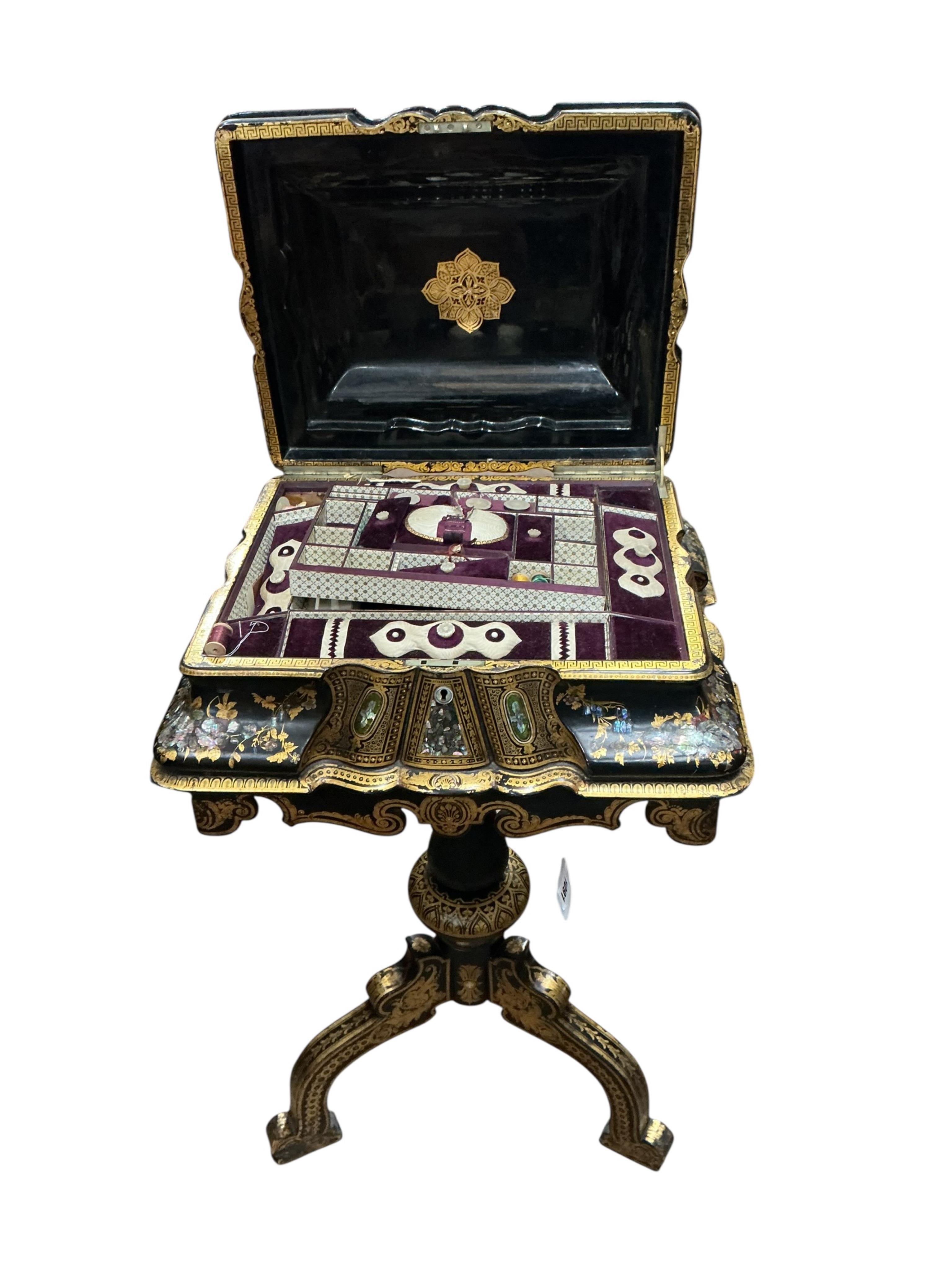 Lot 1091 , A Victorian black lacquered papier maché work table with mother-of-pearl inlay, width 48cm, depth 41cm, height 85cm