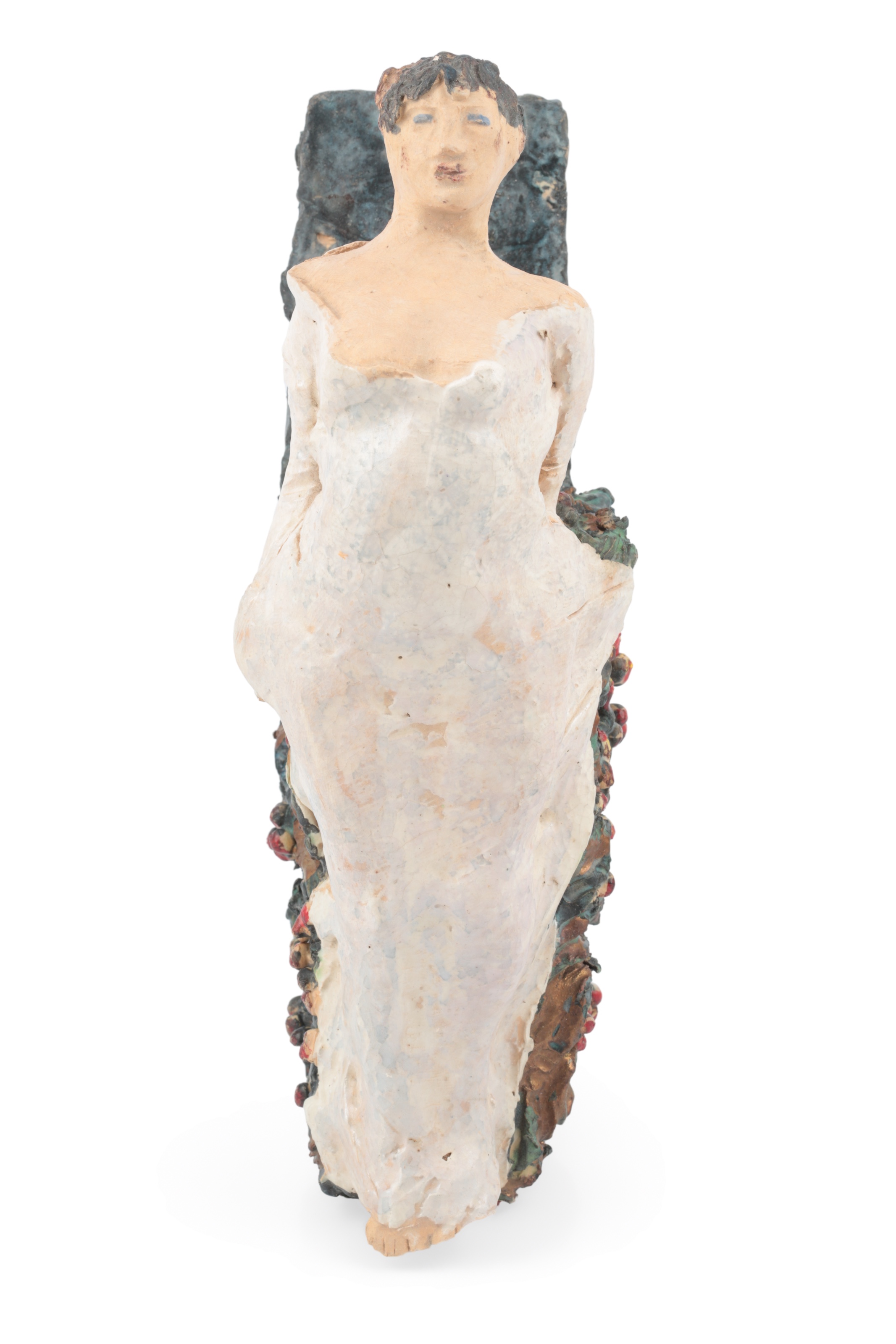 § Quentin Bell (1910-1996) for Fulham Pottery: A 'Levitating Woman' figure, her lower body resting on a naturalistic foliate pedestal, her upper half suspended in the air, painted earthenware, 34cm x 19cm x 10cm