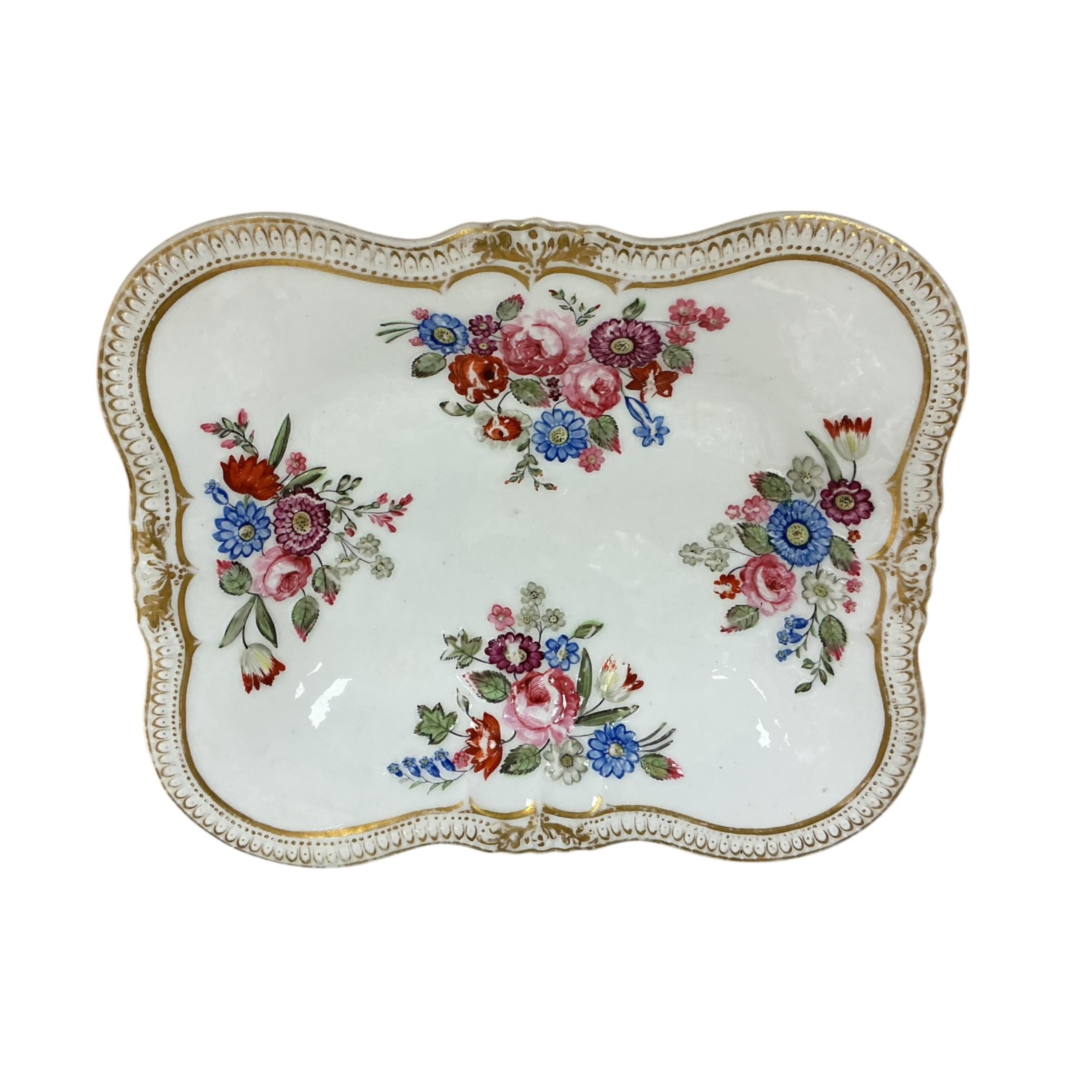 A rare John Yates of Shelton, floral moulded dish, 1825-35, and a Staffordshire porcelain plate (2), dish width 23.5cm, depth 19.5cm.