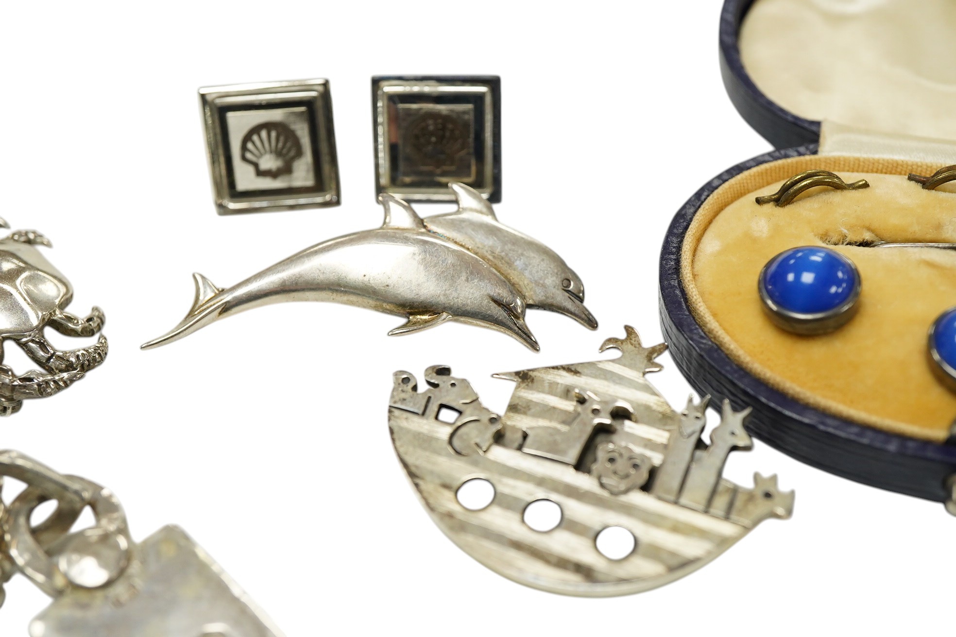 A collection of jewels, comprising: a silver ingot pendant on a white metal chain; three silver brooches designed as a crab, Noah's Ark and two dolphins respectively; a blue paste dress set; and a pair of silver cufflinks bearing the Shell logo, British hallmarks